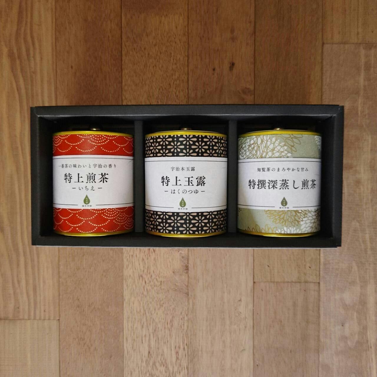 ◇伝統和紙の茶缶、やすらぎのひとしずく 日本茶厳選茶葉3種詰め合わせ 5,000円分