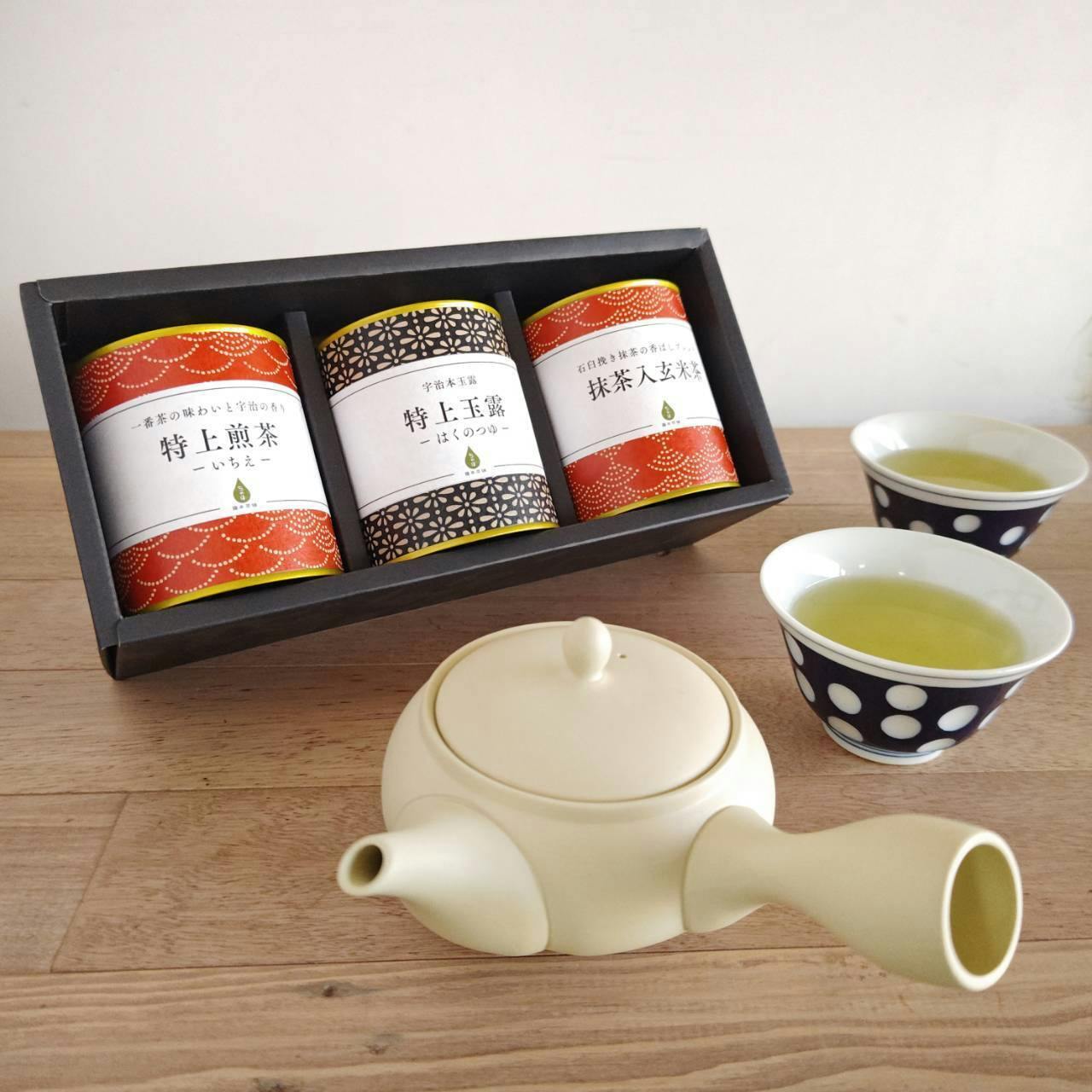 ◇極みの安らぎギフト 厳選茶葉3種+常滑急須・湯のみセット 15,000円分