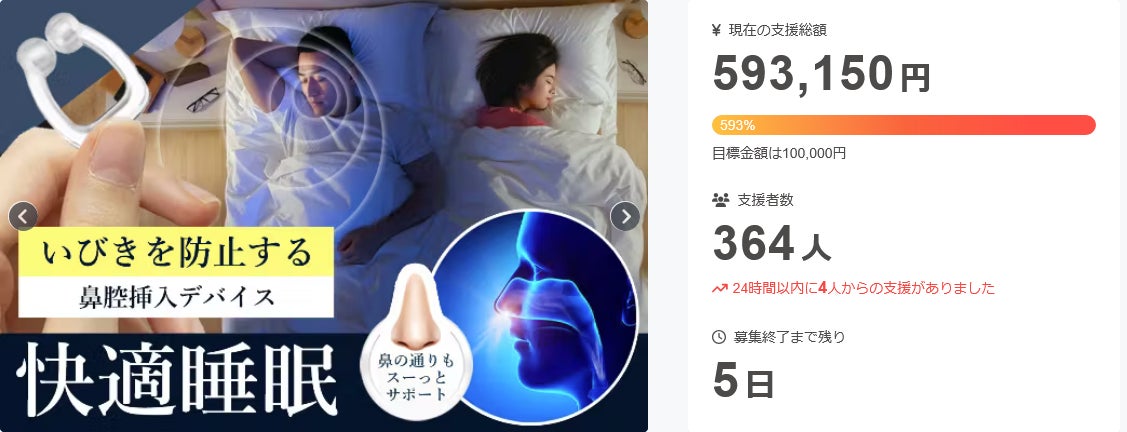 ご支援頂いた皆様、CAMPFIREをご覧の皆様大好評掲載中の『いびき防止デバイスSLEEP MAGIC』でございますが、【残りわずか5日間】でございます!多大なご支援にスタッフ一同、感謝感激をしております。誠に!ありがとうございます。既にご支援頂いている皆様へ厚くお礼申し上げます。皆さまのお手元に届く時まで、最後まで努力して参りますのでSNS等、またご家族様やご友人、知人様へと、まだまだ拡散頂きぜひ、引き続き皆様のお力をお貸しください!今後とも何卒、宜しくお願い申し上げます。↓↓↓↓