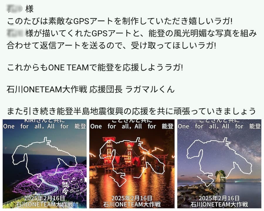 今回は、石川ラグビーでつながる実行委員会が特別に用意したアプリを用いることで、歩いた軌跡は能登各地の風光明媚な風景と画像合成され、ラガマルくんから『返信アート』のメールが届く仕組みを構築しました。