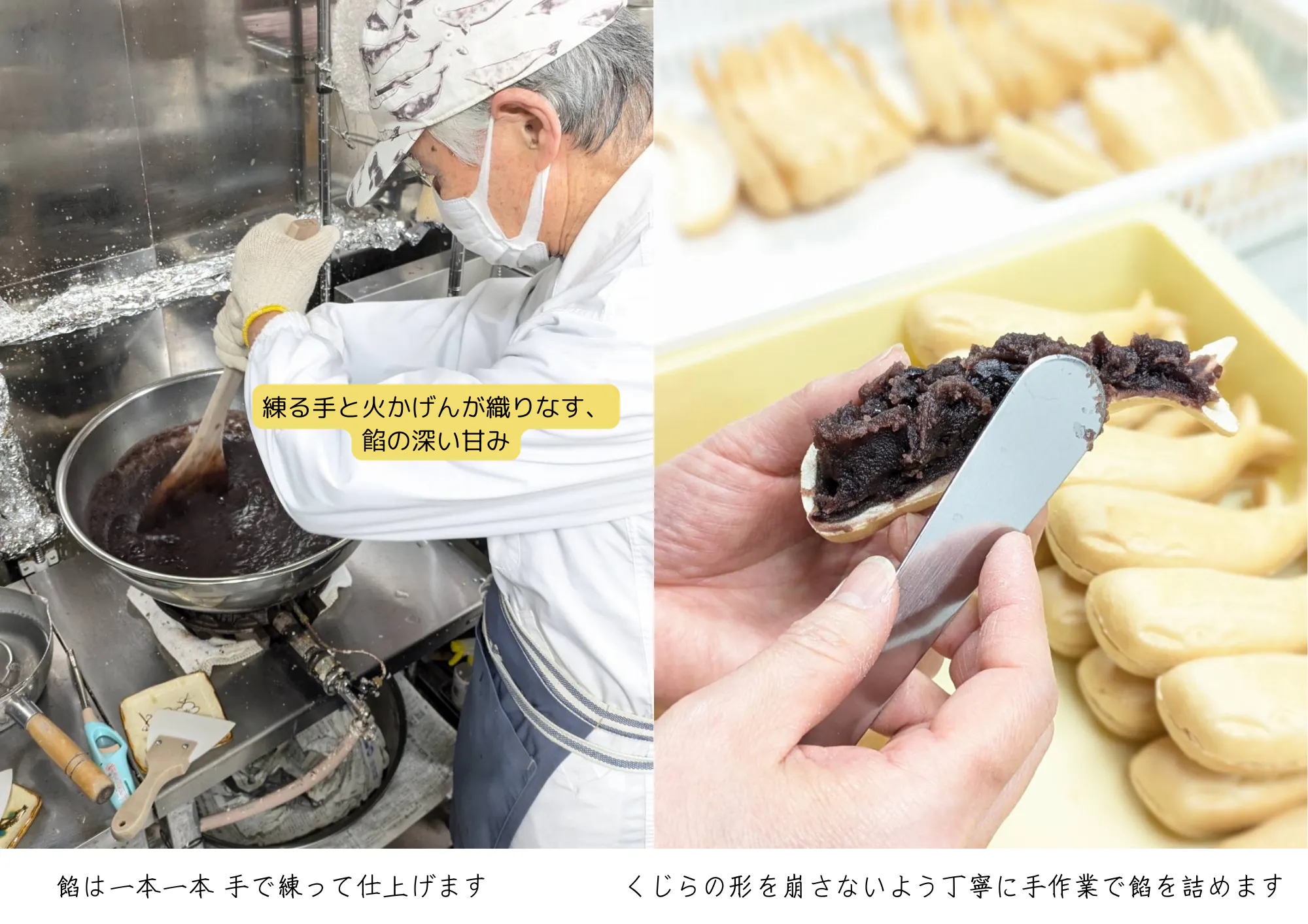 私たちが大切にしているのは、伝統の技術と素材へのこだわり。「くじらもなか」は、その名の通り遊び心あるくじらの形に、地元ならではの餡を詰め込んだ特別な一品です。お客様の「おいしい!」という笑顔が、私たちにとって何よりの喜びです。
