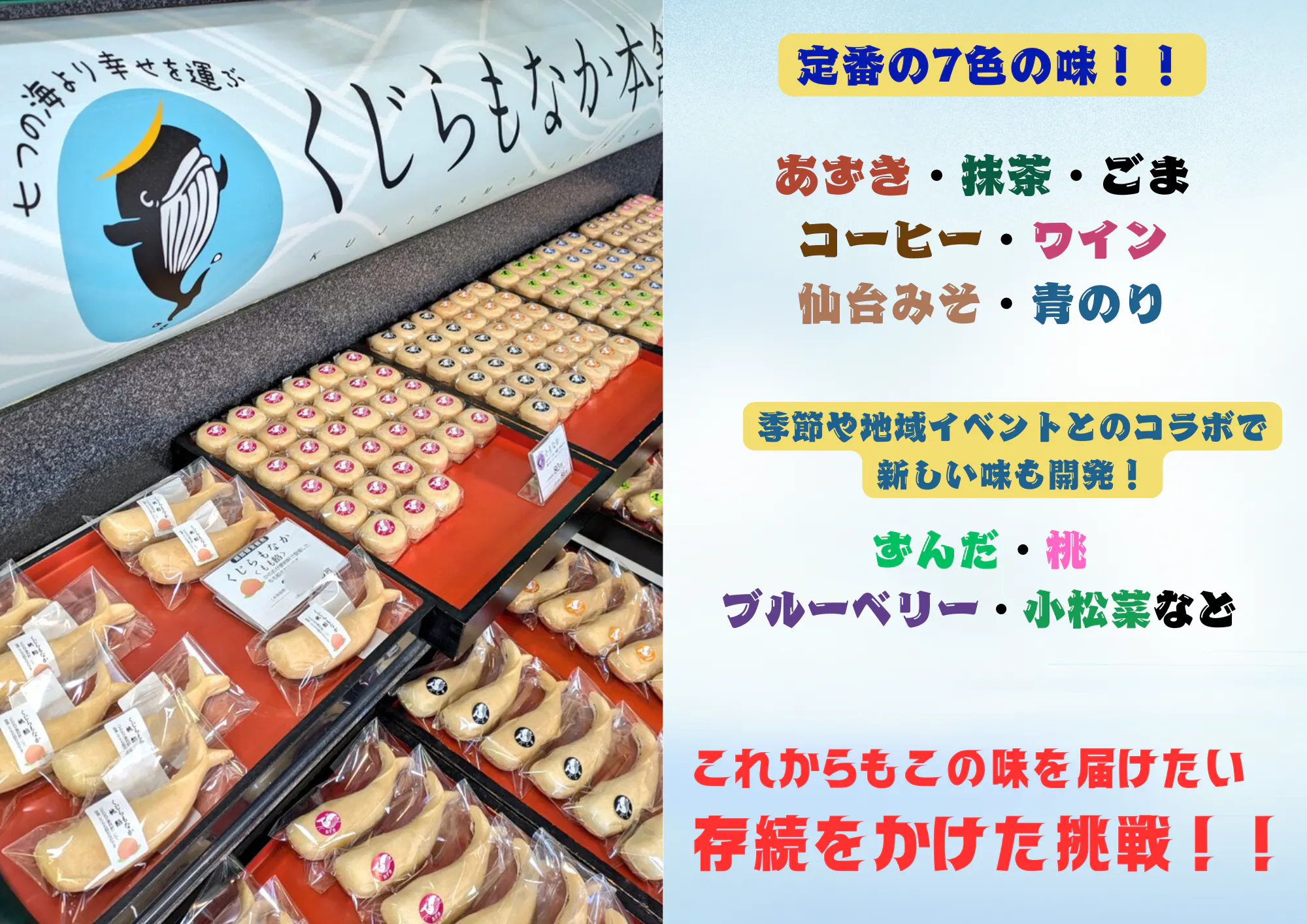 「くじらもなか」は、地域の食材と文化を活かした和菓子です。ずんだや味噌など地元の味に加え、新たに開発した特製の桃餡やレーズンバターチーズ餡など、和洋の魅力を融合させた新商品で、宮城の魅力を発信していきます。