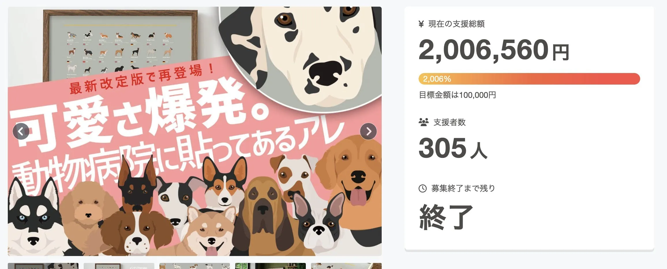 2025/11/04 10:00応援をいただきましたみなさま、「最新改定版【動物病院の犬ポスター】犬好きとおしゃれなインテリアのためのデザイン」プロジェクトチームの富田でございます。おかげさまでプロジェクトが無事終了いたしました。(連休明けのご連絡となり遅くなりまして大変失礼をいたしました。)なんと、最終的に2,257,030円のご支援をいただきました!あらためて感謝申し上げます。みなさま、本当にありがとうございました。なお、リターン商品の発送は既に開始しております。先の活動報告にてご案内の通り「10月お届け予定」の一部のリターンにつきまして、使用部材の供給が遅れた影響で、発送が最大で2週間前後ずれ込む見込みとなりました。楽しみにお待ちいただいている中でのご案内となり、大変申し訳ございません。11月以降のリターンは、現時点では当初のスケジュールどおりで進行しております。→ 発送は「お届け予定月の月末」です→ 発送が完了しましたらCAMPFIREのメッセージ機能にてお知らせいたします最後にご不明な点などございましたらお気軽にご連絡ください。最後までしっかりお届けいたしますので、引き続きどうぞよろしくお願いいたします。 もっと見るリターンお届けについて(10月分⼀部遅延のお詫び)