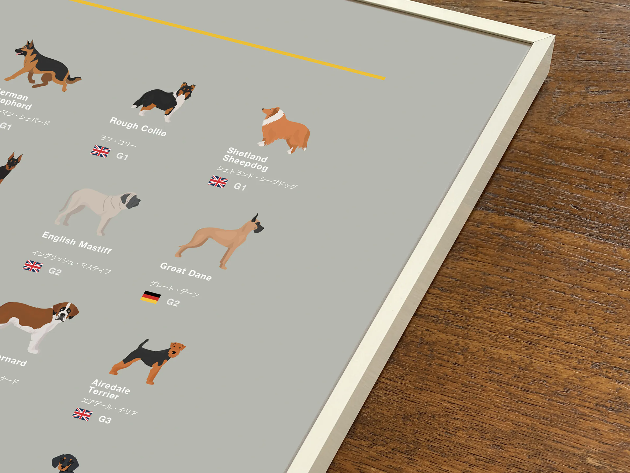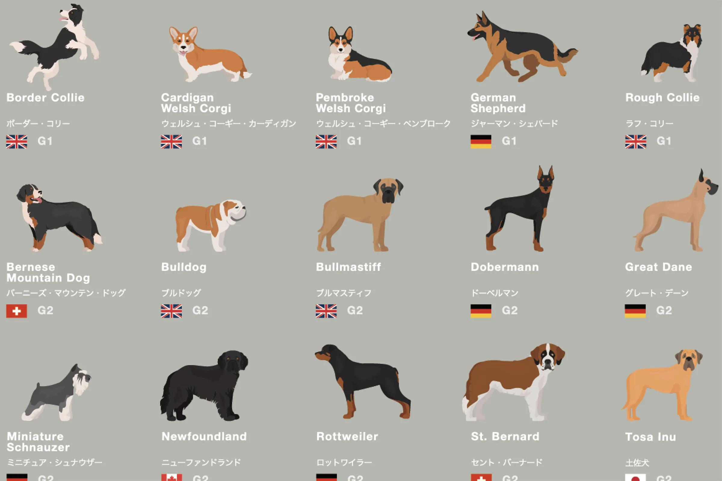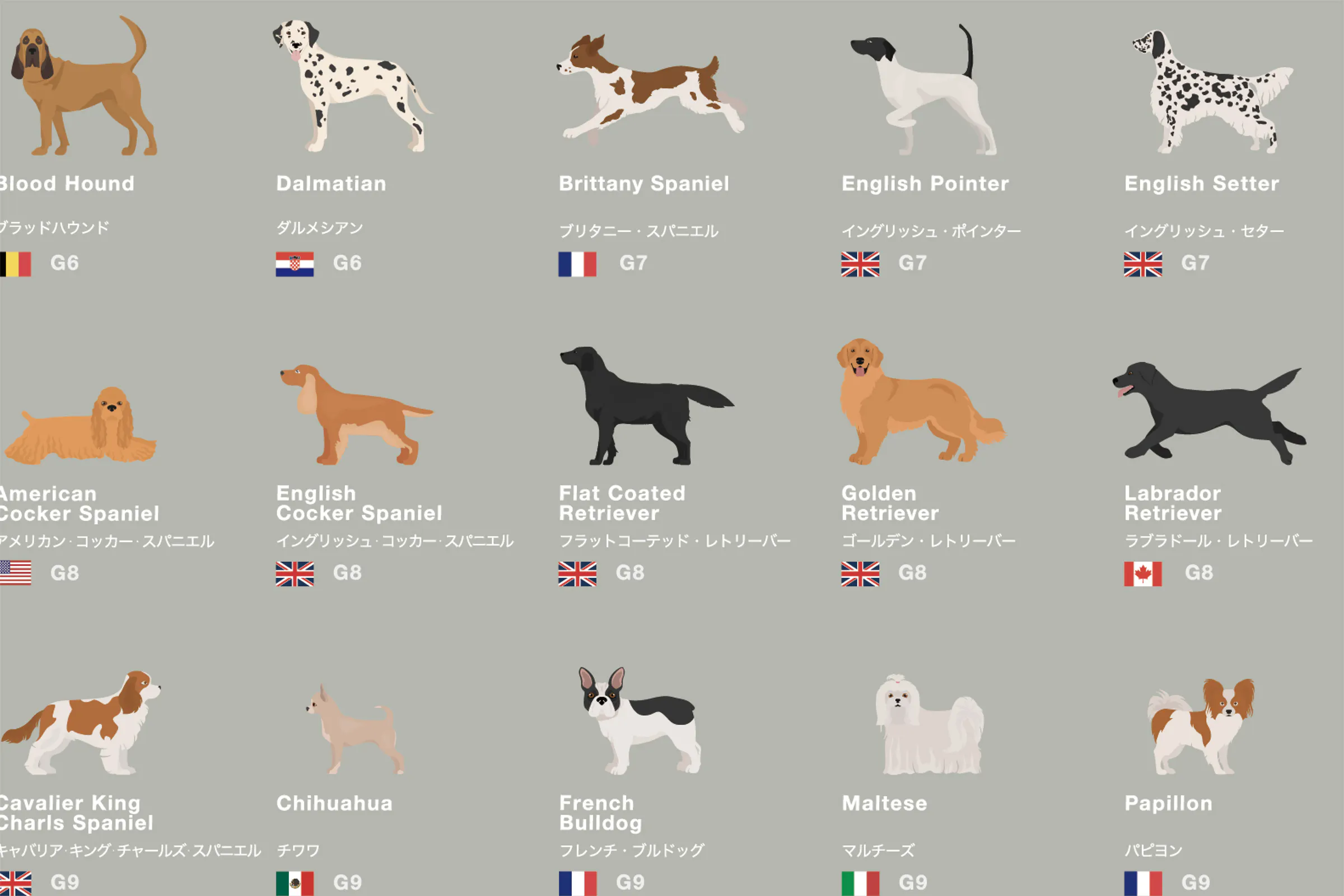 ※ 掲載順序:G1からG10までのグループ順。グループ内では犬名のABC順。同犬種がいる場合はABC順よりも隣に配置する事を優先。