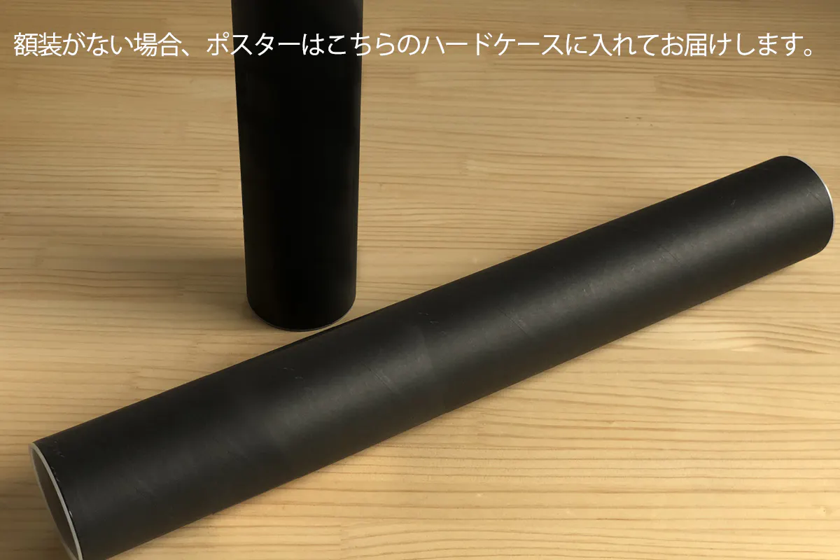 ポスターは丁寧にまるめて包装し、ハードケースの特注ブラックチューブ(紙管)にて「折れなし保証」でお届けします。