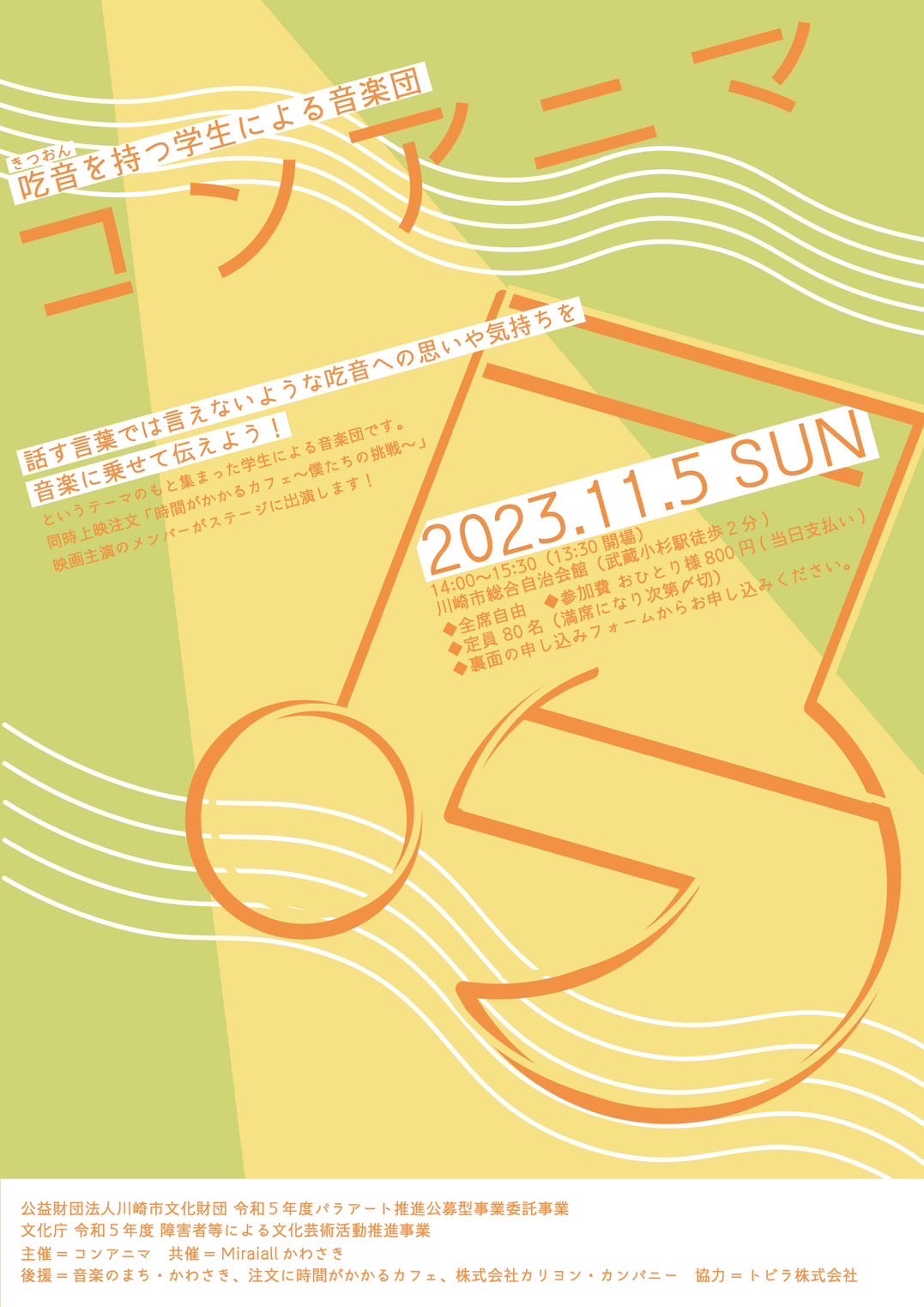2024年2月、吃音に対する話す言葉では言えない思いや気持ちを歌、音楽に乗せて表現しあい、吃音当事者同士で音楽を通して繋がる空間を作ろうと「コンアニマ〜吃音を持つ学生による音楽団〜」を立ち上げました。