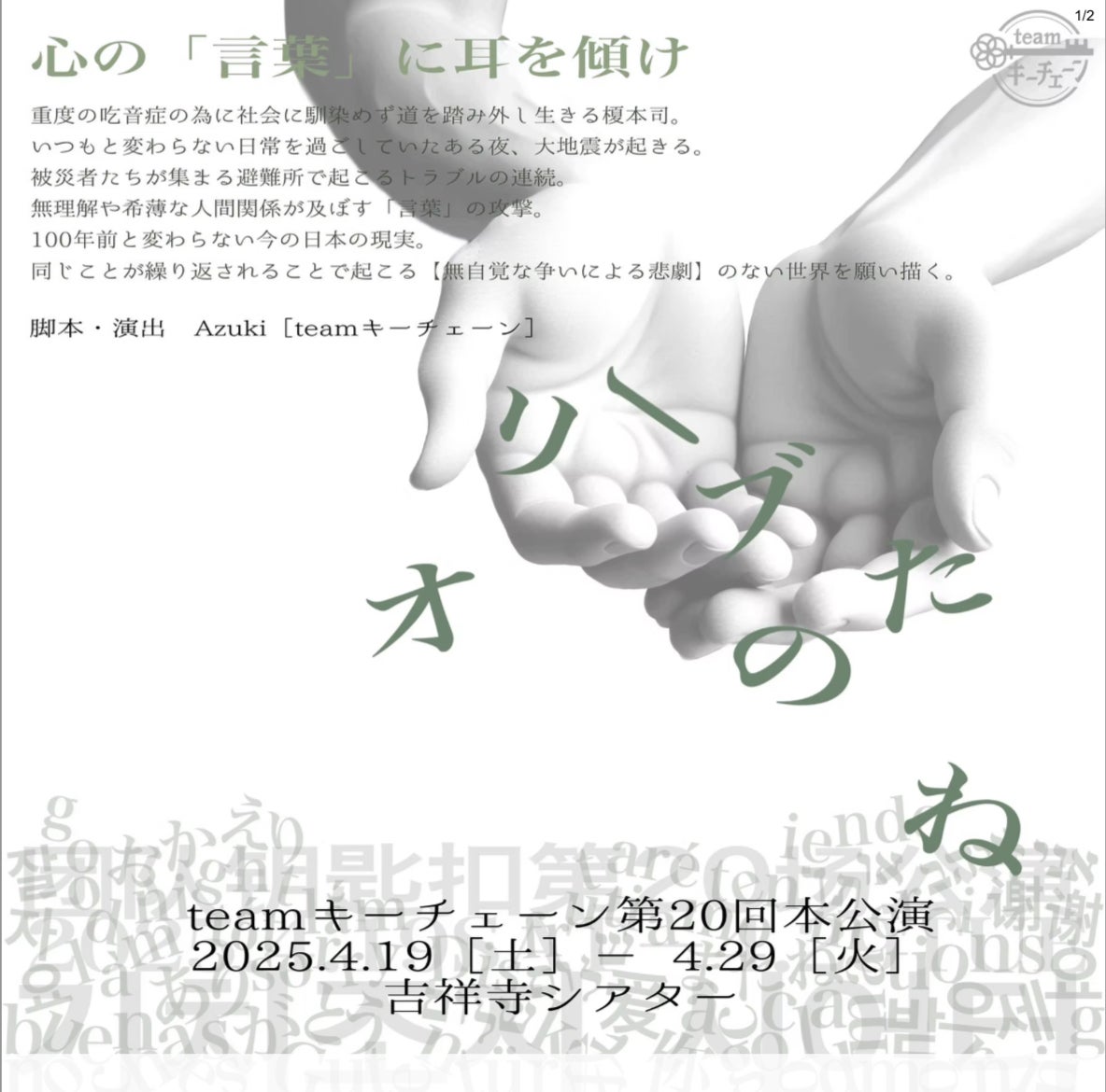 2025/04/21 14:05お久しぶりです!なんとこの度コンアニマ初のオリジナル楽曲「con♪anima〜この歌はいつか音を纏いますか?〜」がteamキーチェーン様の「オリーブのたね」という演劇作品のエンディングに使用されることが決まりました!!先日代表のAzuki様からご連絡頂き実際に通し稽古を拝見させて頂きました。吃音を持つ男の子が主人公の作品となっており、言葉がうまく伝わらないことによる無自覚な争いやトラブルの数々が起こります。感想はたくさんあって皆さんにお話ししたいのですが、これはぜひ生で見てほしいです!!吃音で悩んでいる方はもちろん、言葉に対して何か葛藤を抱えている方、過去に悩んだ経験のある方、そんな一人ひとりの心にきっと届く作品だと思いました。この素晴らしい作品に私たちの楽曲を使用していただけること、本当に光栄で、嬉しく思っております。またこのような貴重な機会を頂けたのも、ご支援頂いた皆さんのおかげです。本当にありがとうございます!!公演は4月19日〜4月29日までです!実はオリジナル曲のレコーディング音源はリリース前初の公開となりますのでぜひお越しください!!公演情報はコチラ↓https://www.teamkey-chain.net/%E3%82%AA%E3%83%AA%E3%83%BC%E3%83%96%E3%81%AE%E3%81%9F%E3%81%ADリターンも誠意制作中です!完成次第随時発送となりますので今しばらくお待ちください! もっと見る