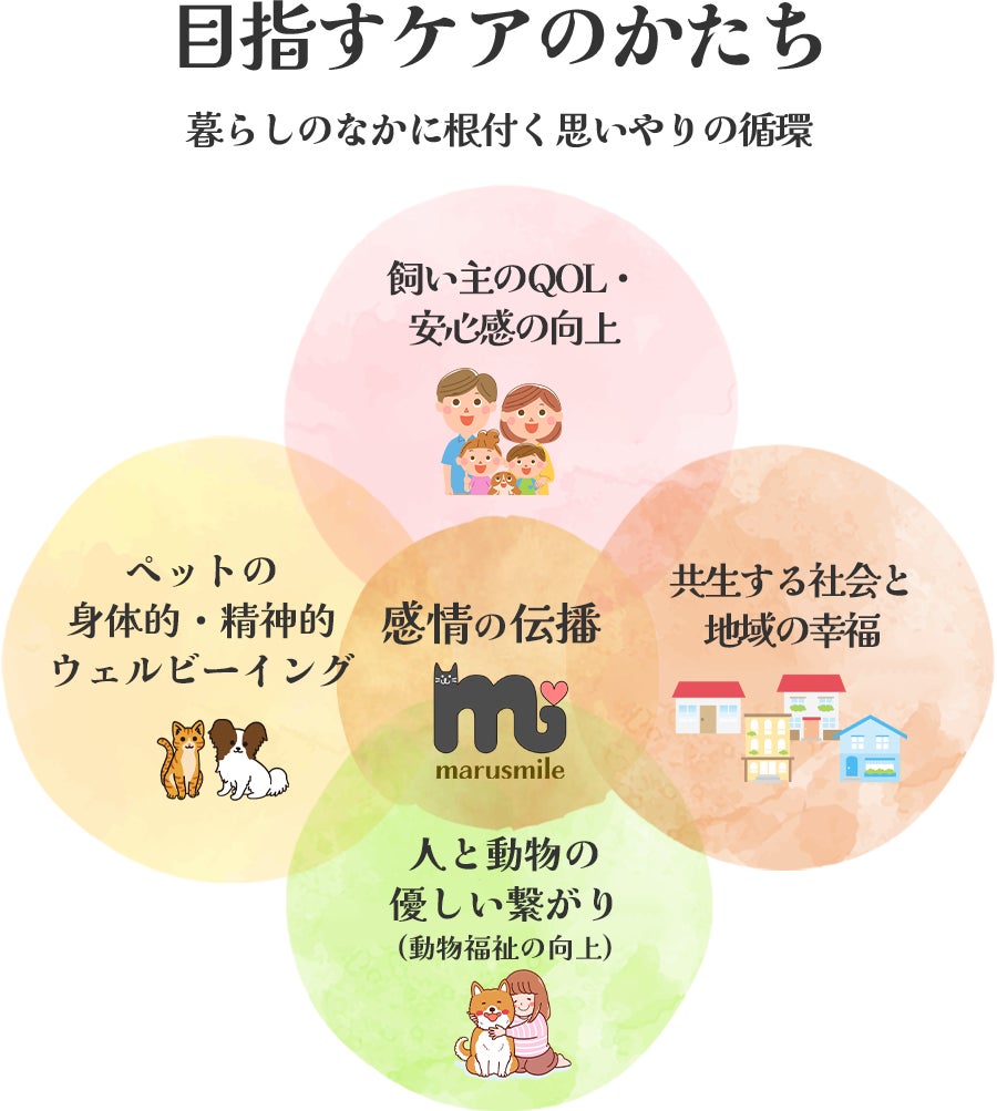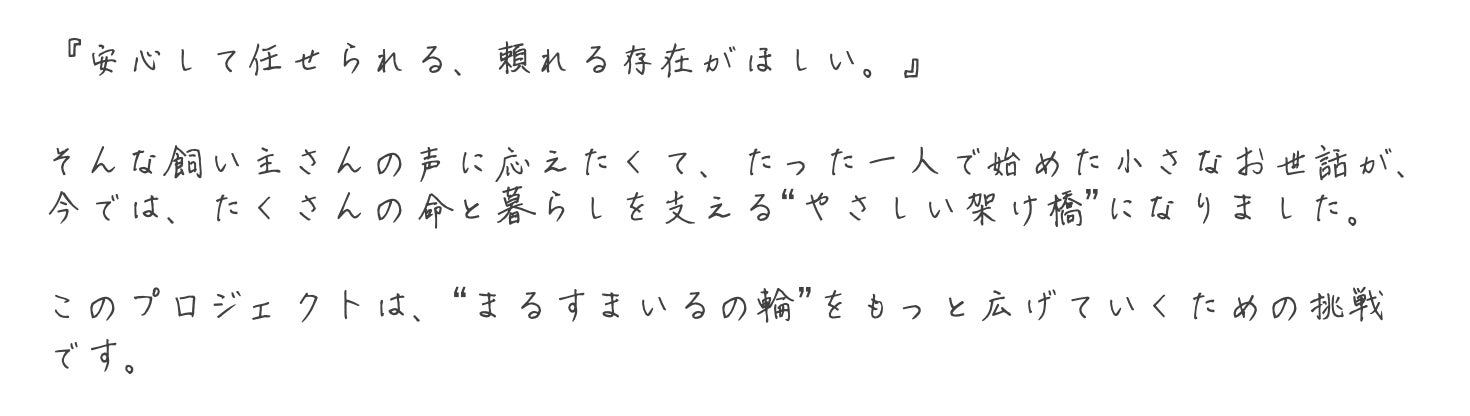 そして今、「まるすまいるコネクト」を通して、ペットが生まれてからその命を見送るまで、どんなときにも、安心して任せられる人や場所と、スムーズにつながれる社会をつくりたいと考えています。