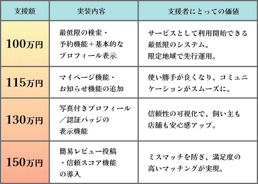 ご支援が多く集まるほど、より多くの方に使いやすく、信頼性の高いプラットフォームをお届けできます。