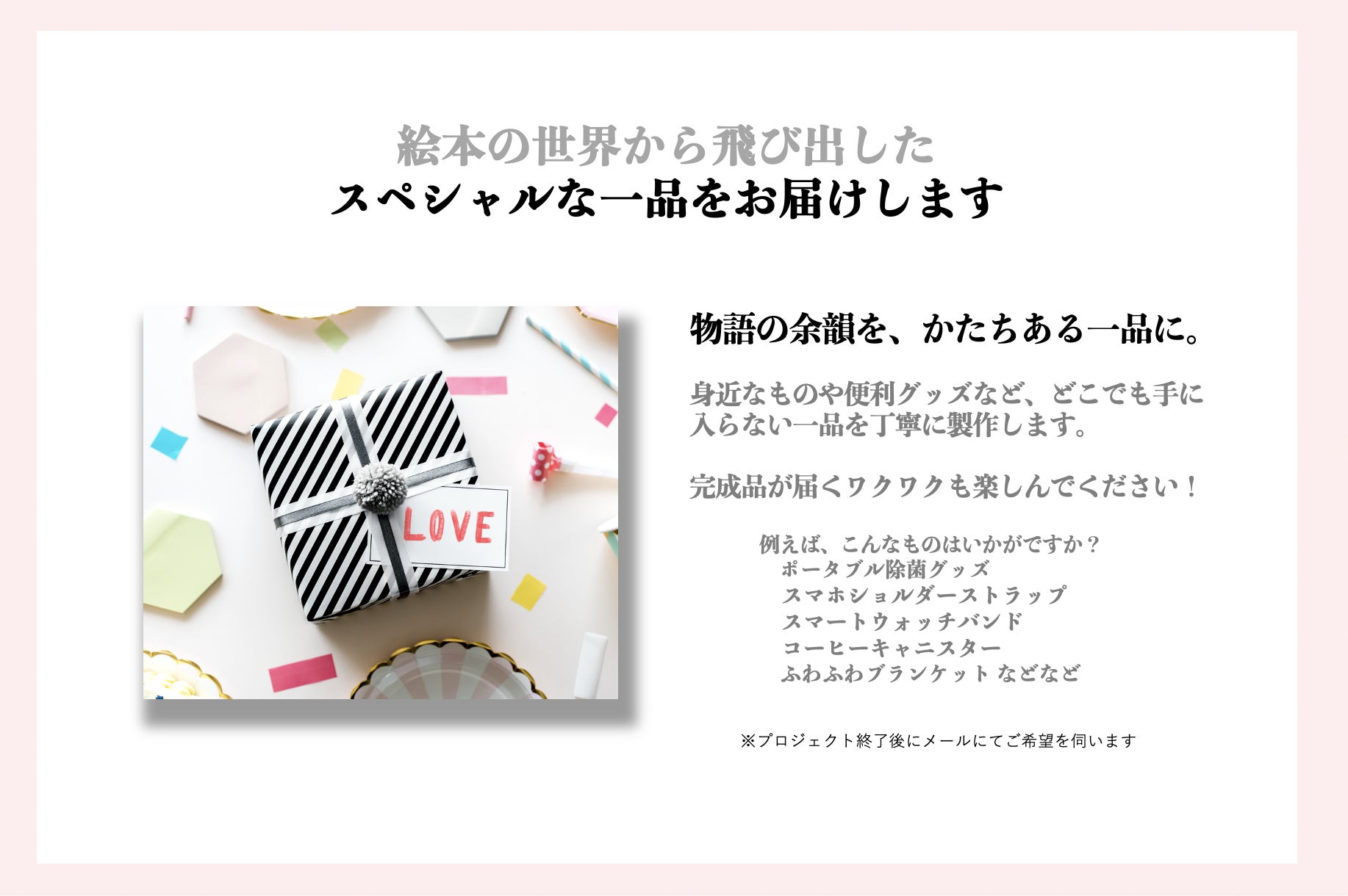 「リターン=単なる物品」ではなく“想いをお届けする手紙のようなもの”として心を込めて製作しています。