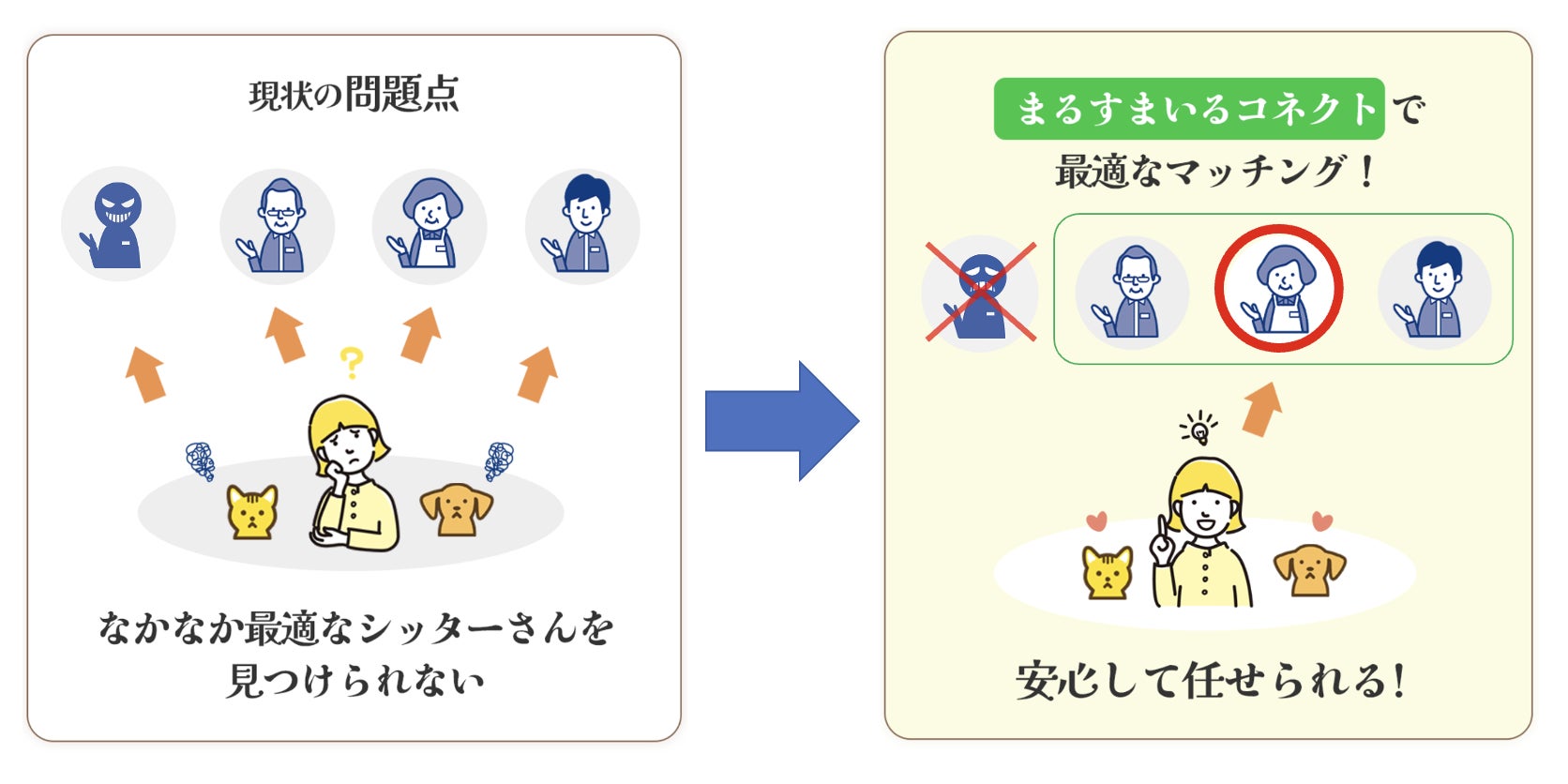 まるすまいるコネクトは、「独自のこだわり検索」によってミスマッチを解消し、理想のシッターとの出会いを叶えることで、ペットも飼い主も安心して笑顔になれるサービスの実現を目指します。
