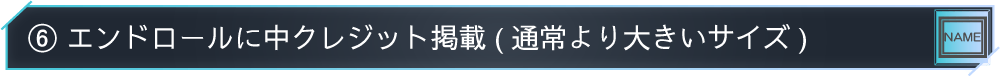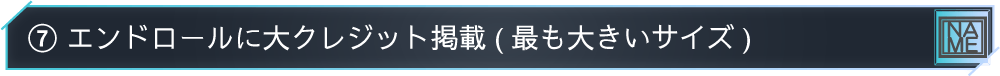 ゲーム内のエンドロールにて通常より大きなサイズであなたの名前を掲載します。