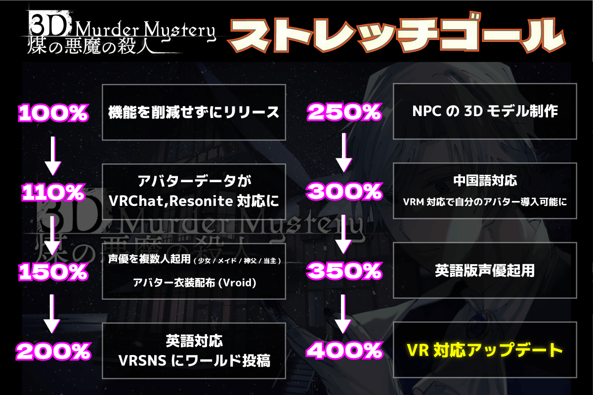 VRMファイルでの配布を予定していますが、達成率が110%を超えた場合はVRChat・Resoniteに対応したファイルも追加で配布します。