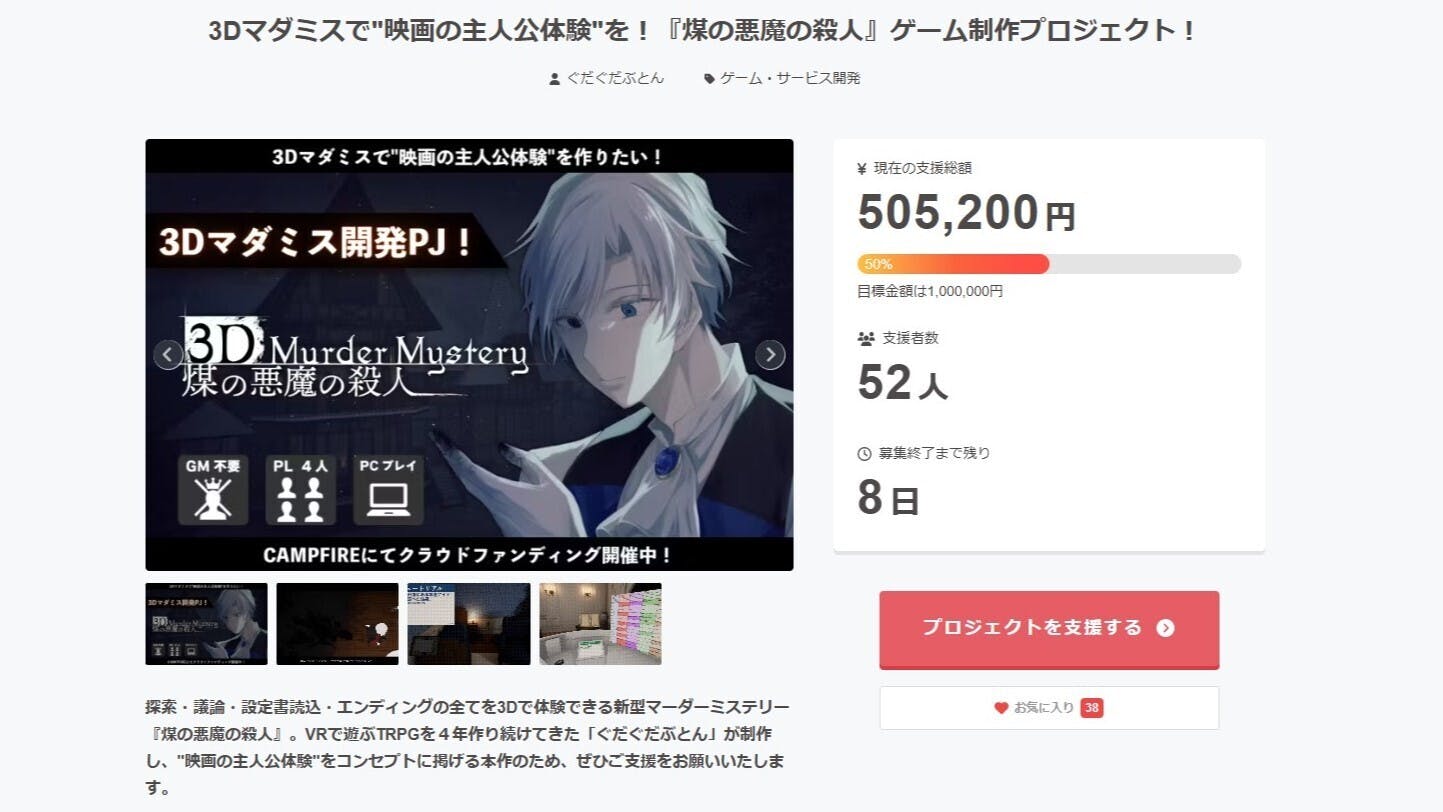3Dマーダーミステリー『煤の悪魔の殺人』の支援額が50%を突破しました!!!