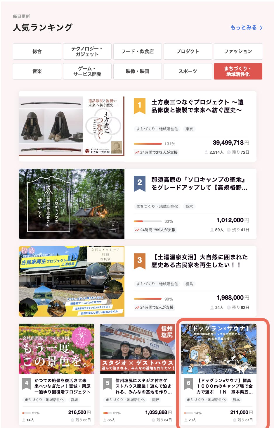 そして、CAMPFIREのトップページにある人気ランキング6位にランクインしました。