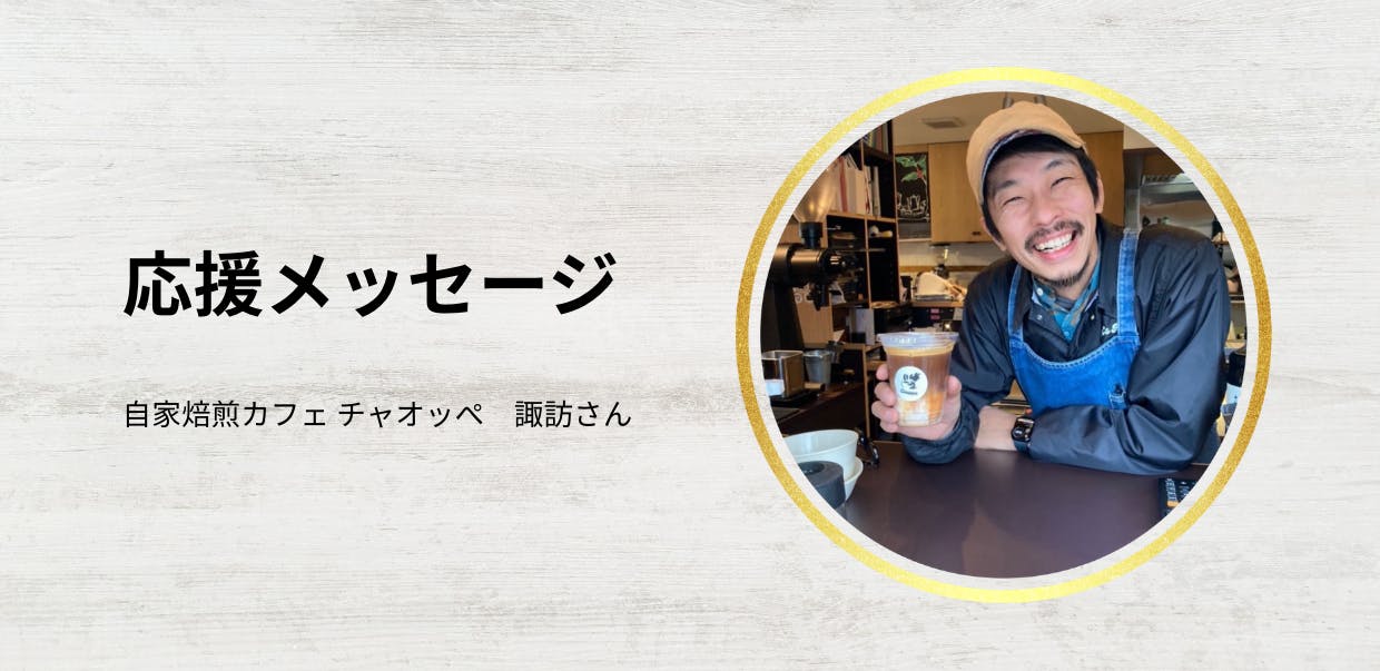 今回のクラウドファンディングのリターン品で「トントンコーヒー」を扱っているのですが、「トントンコーヒー」を卸して下さっている「自家焙煎カフェ チャオッぺ」諏訪さんから応援メッセージをいただきました。