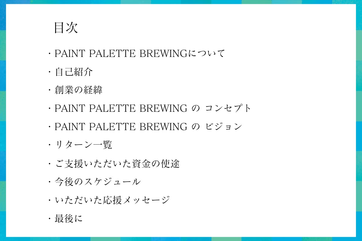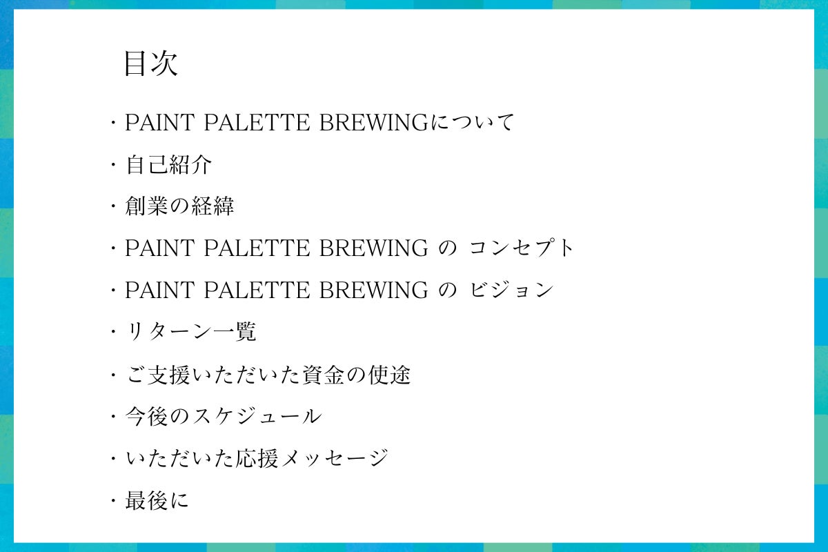 PAINT PALETTE BREWING株式会社の代表の戸上 将吾です。神戸にて、スパ・サウナ施設に併設する形で新たなクラフトビール醸造所の創業を計画しております。長文ではありますが下記お読みいただき、本プロジェクトに興味をもっていただくとともにクラウドファンディングのご支援を検討いただけますと幸いです。