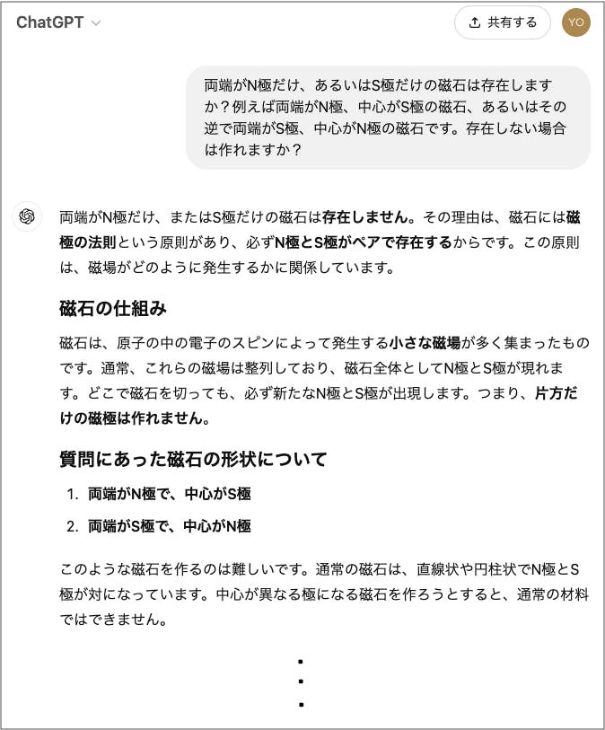 上の写真のように両端がNまたはS極だけの磁石が存在することについては信じ難いと思われるかもしれません。学校ではそのような磁石は存在せず作ることもできないと学びます。実際、中学生のうちの子が理科の先生にこの磁石の話をしたところ全否定されました。ネットで調べても上の写真にあるような磁石は見つけられず、ChatGPTで聞いてもその存在は否定されました。