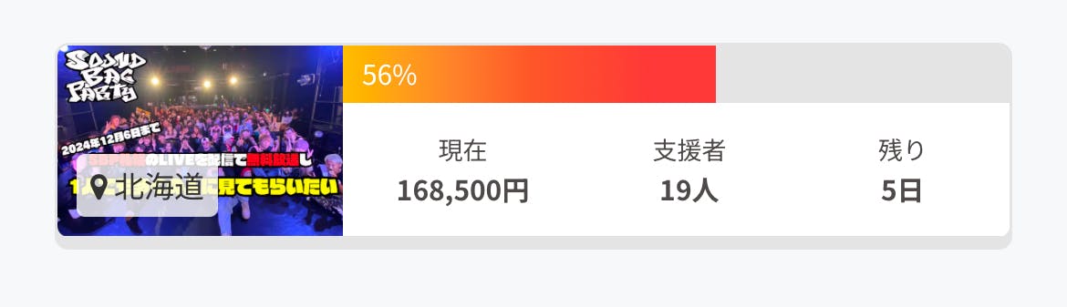 2024/12/01 17:49皆さん、こんにちは!いつも応援いただき、本当にありがとうございます。おかげさまで、クラウドファンディングが目標金額の50%を達成しました!皆さんのご支援と温かいメッセージに心から感謝しています!さて、クラウドファンディングの終了まで残り5日となりました。最後のラストスパート、ぜひ皆さんの力を貸してください!そして、12月7日に開催予定の「SBP」を、みんなで一緒に盛り上げていきましょう!最高のイベントにするために、引き続き応援をよろしくお願いいたします。皆さんと一緒に楽しい時間を過ごせることを楽しみにしています! もっと見る希望の多かったリターン追加しました!