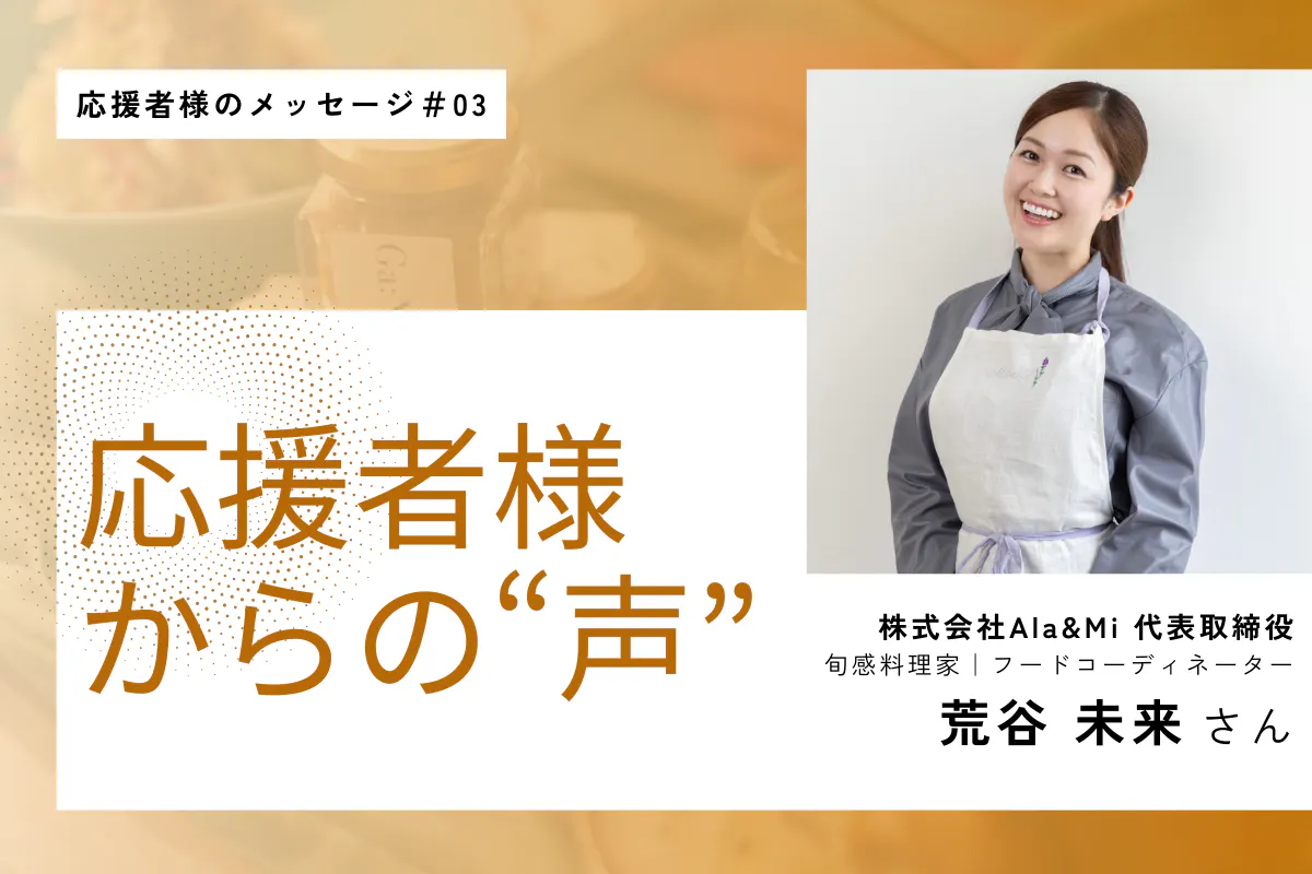 応援者様からのメッセージ第3弾は”株式会社Ala&Mi代表 荒谷未来”さん!