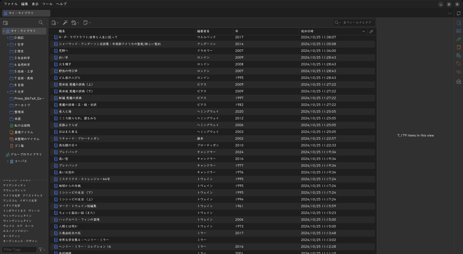たぬきはジャンルを問わずさまざまな本を読んできました。元は理系、現在は文系という経歴も相まって、哲学、社会学、心理学、文学、言語学、政治学、経済学、理学、工学、情報学、医学などなど、さまざまな分野の本を読み漁ってきました(Zoteroという文献管理ツールを使用し、下の画像のように、過去に読んだ本をデータベース化しています。まだ半分も終わっていませんが……)。また、大学図書館で働いていた経験もあるので、図書館のスタッフがどれほど本を愛していて、その魅力を伝えるためにどんな工夫をしているのかもよく知っているつもりです。