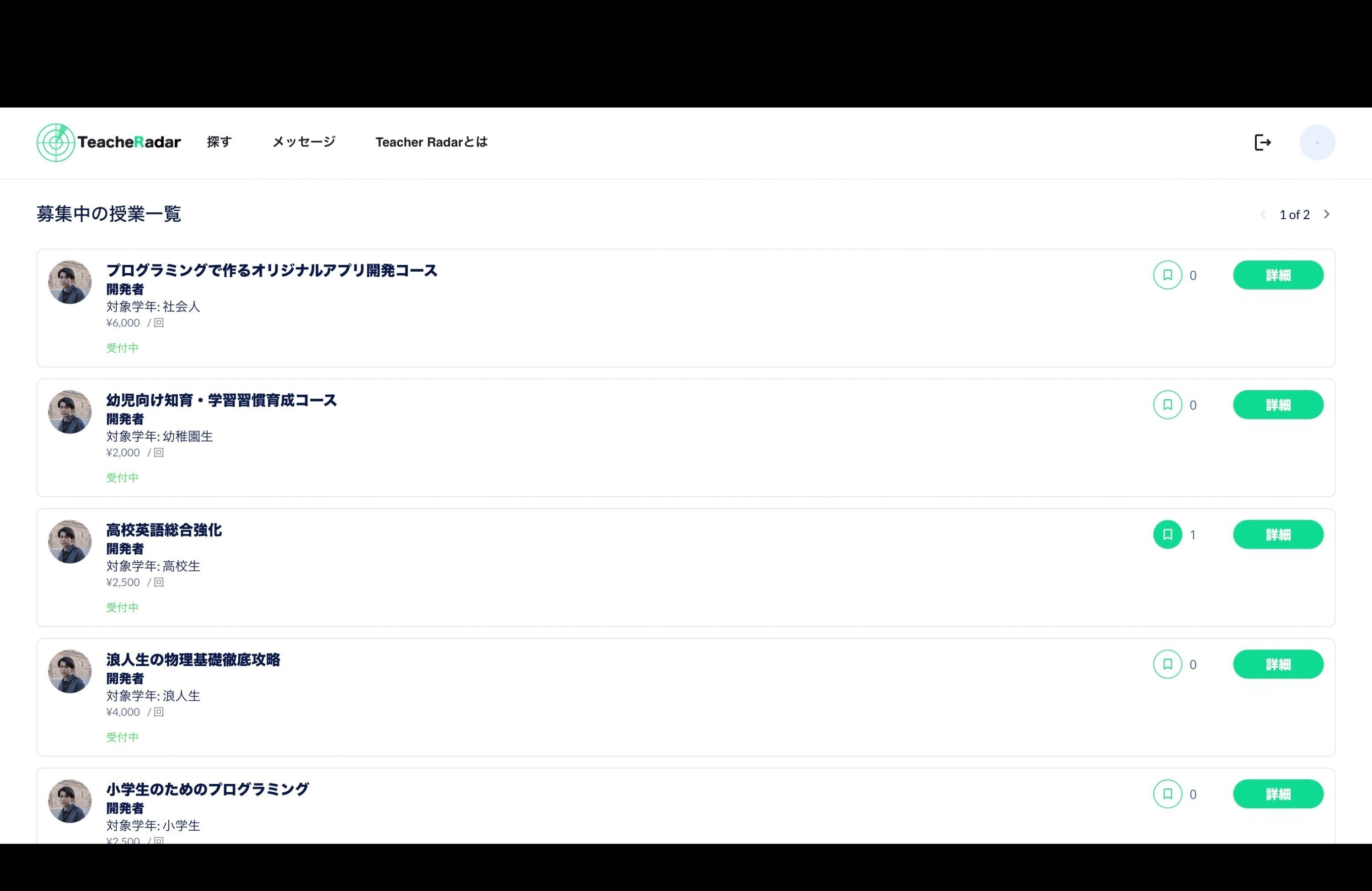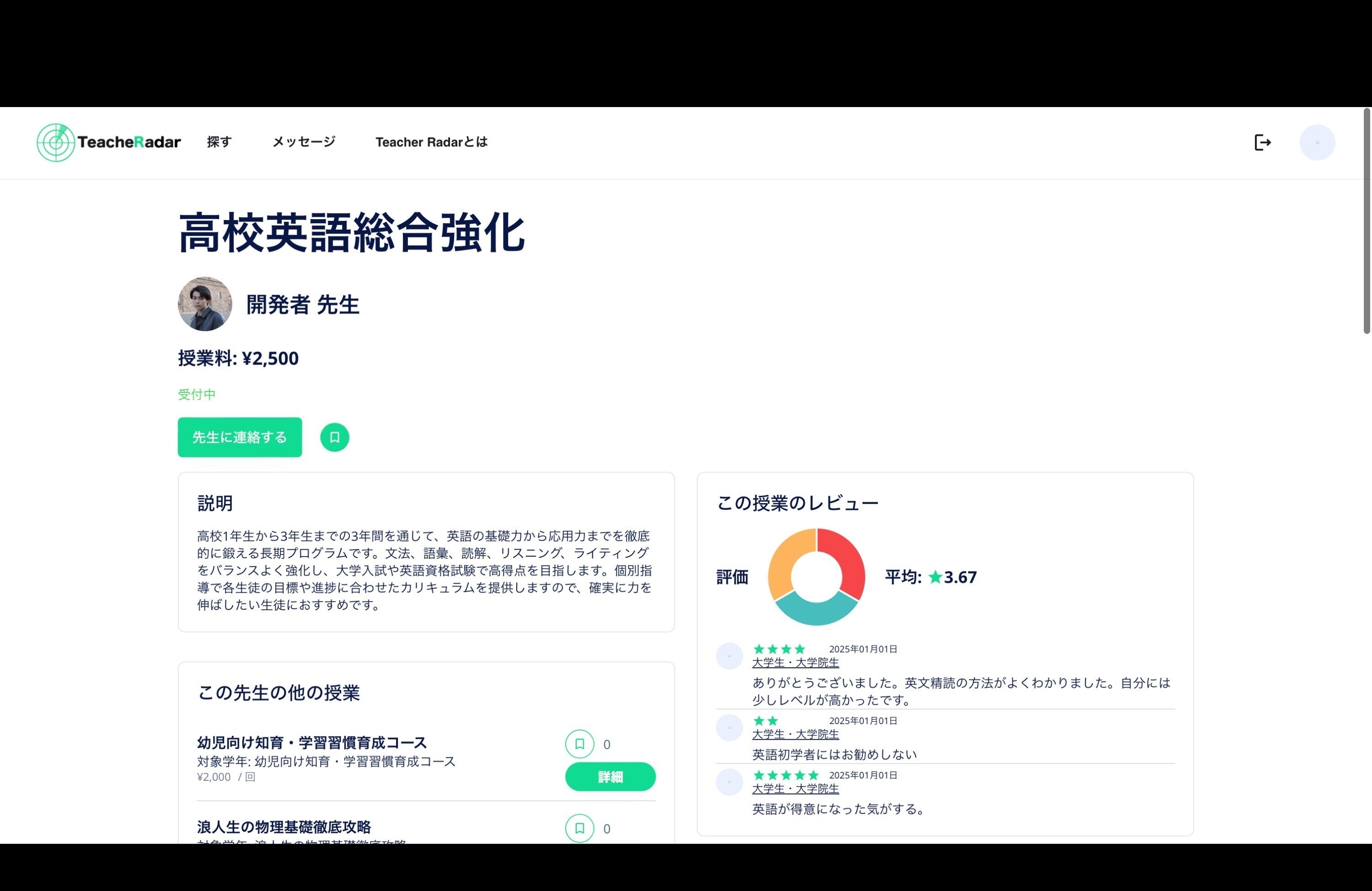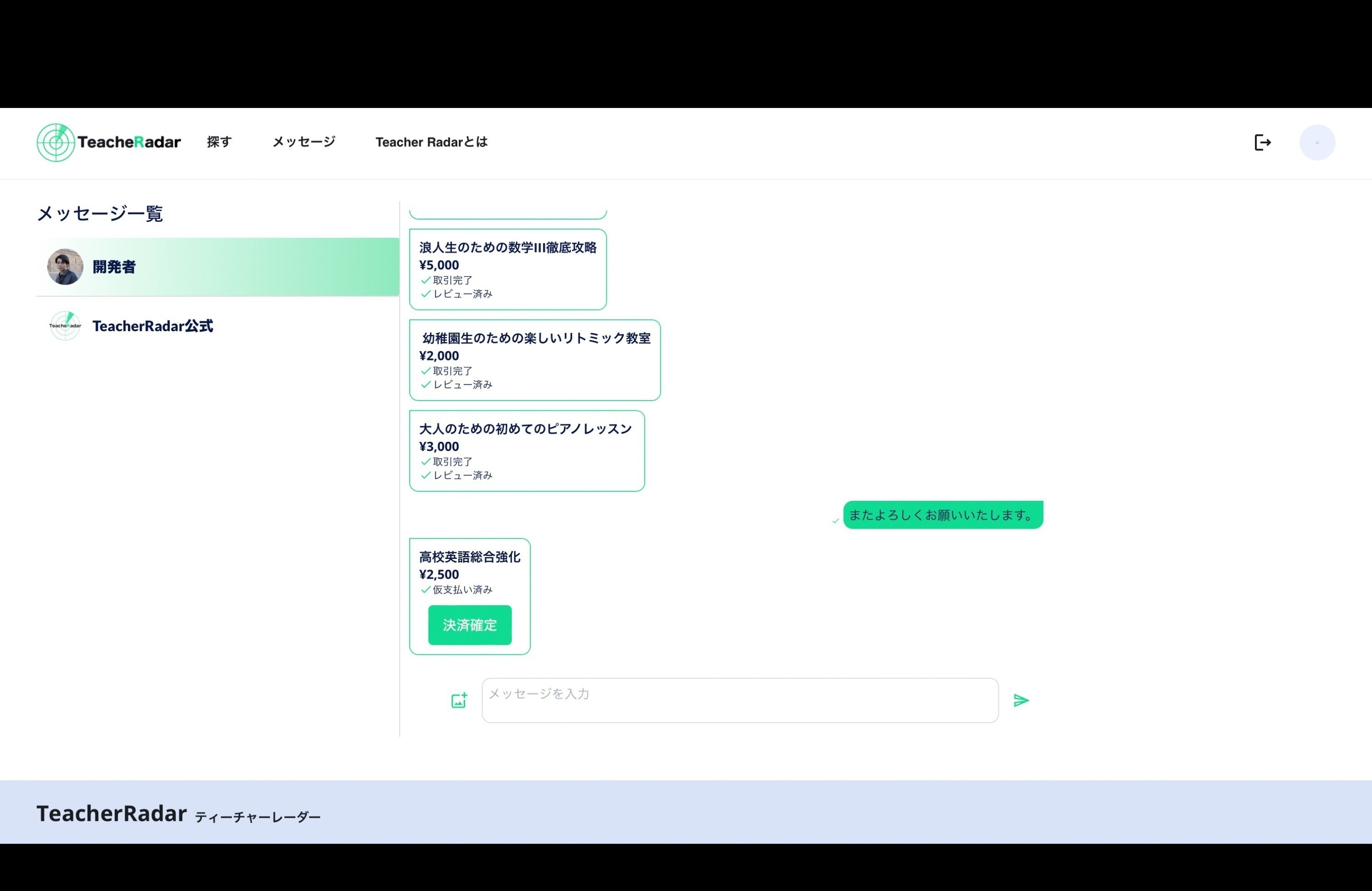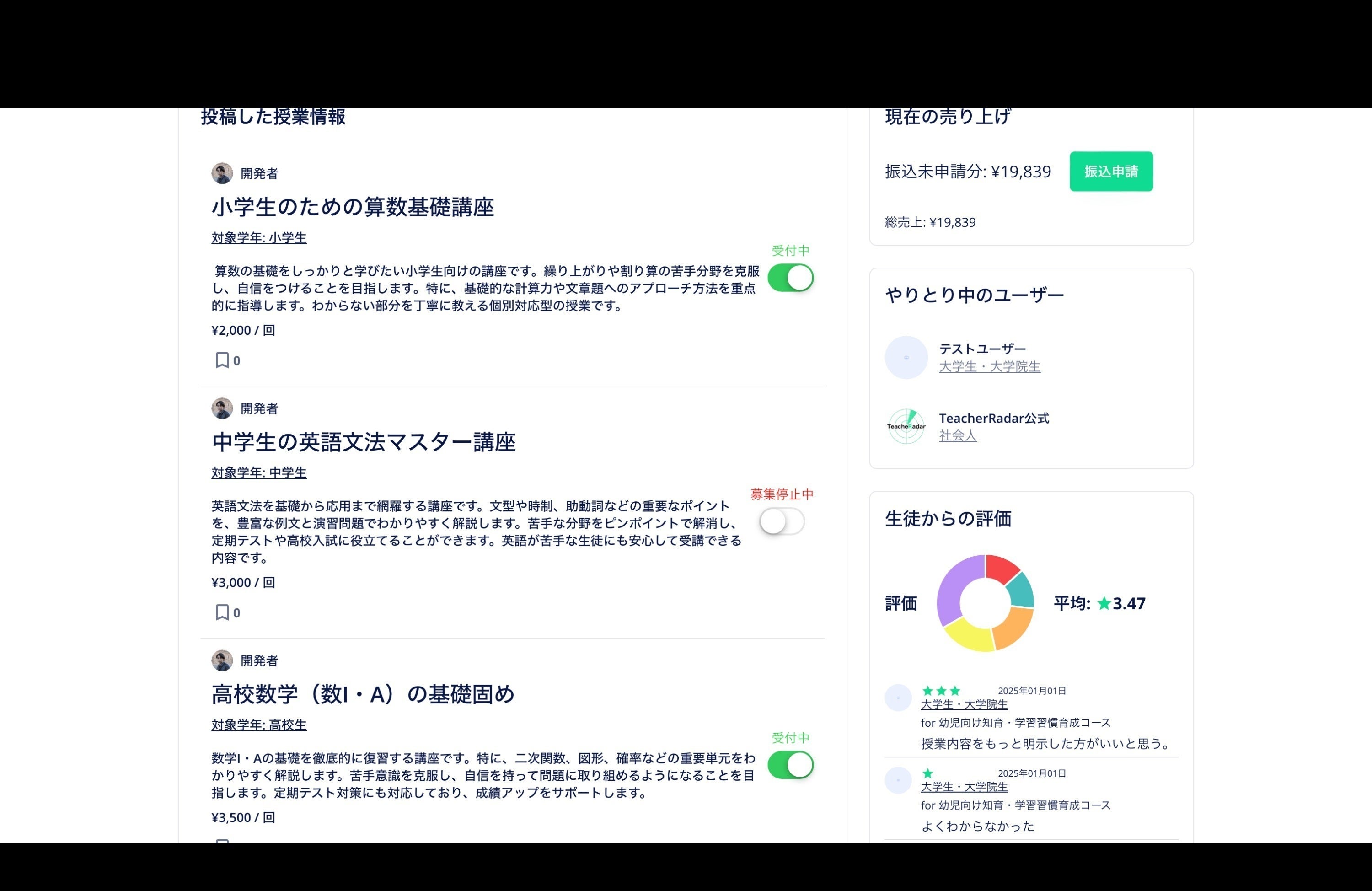 TeacherRadarの特徴は、個人が生徒を募集できる点です。生徒の募集、生徒とのやりとり、決済までが全てサイト上で実行できます。システムの仕様上、授業形態は単発/長期、対面/オンラインなどどういったものにも対応できます。開発段階の画面を4枚掲載しておりますのでご覧ください。また、Instagramアカウントの最初の投稿でシステムを紹介しておりますので、ぜひそちらもご覧ください。