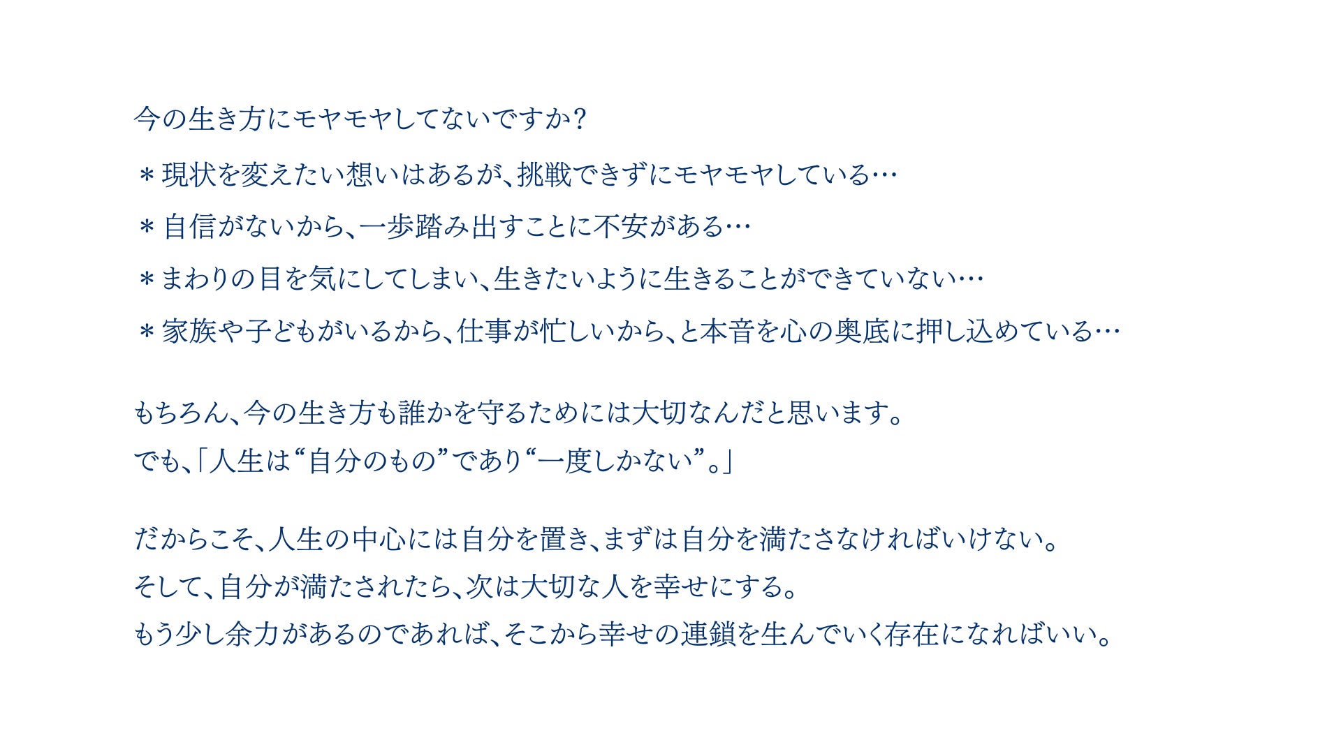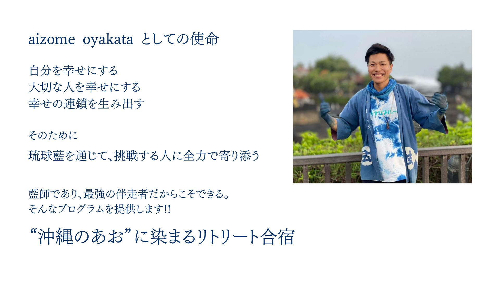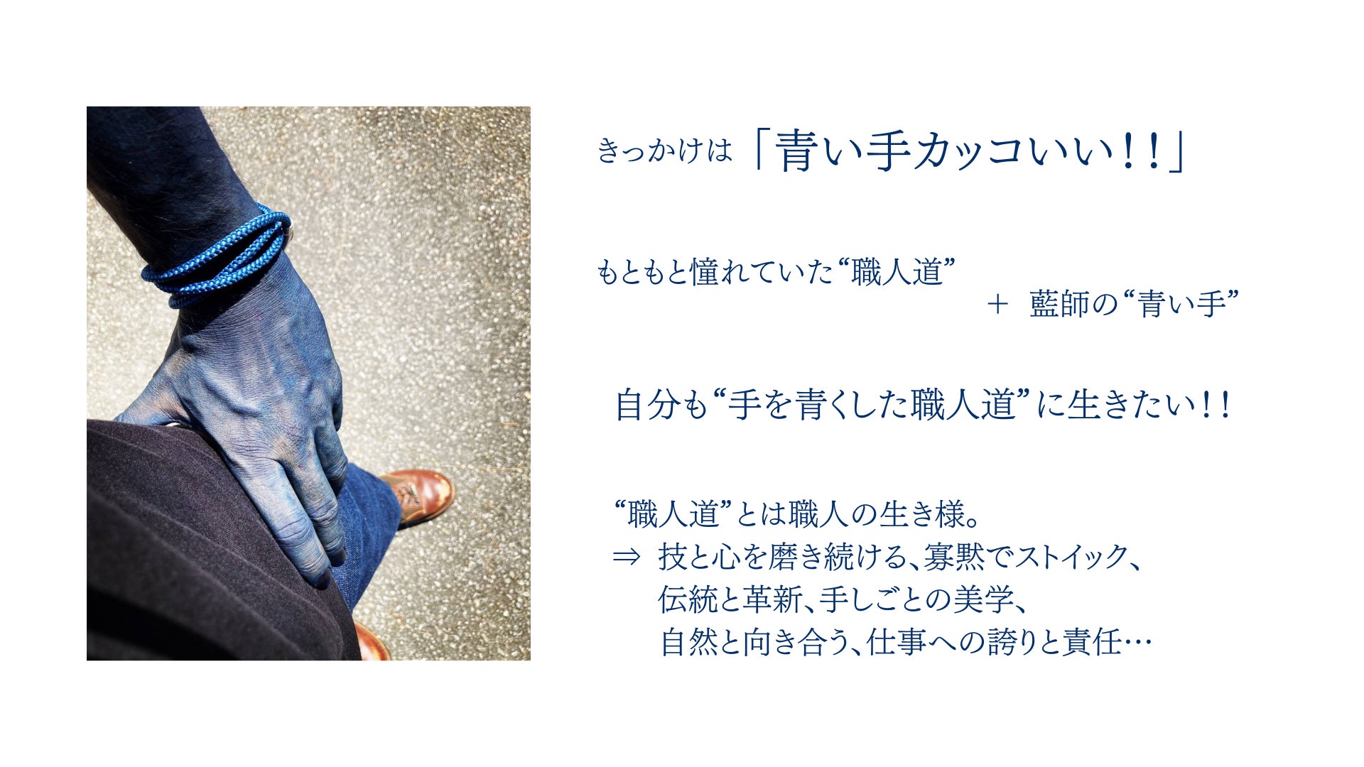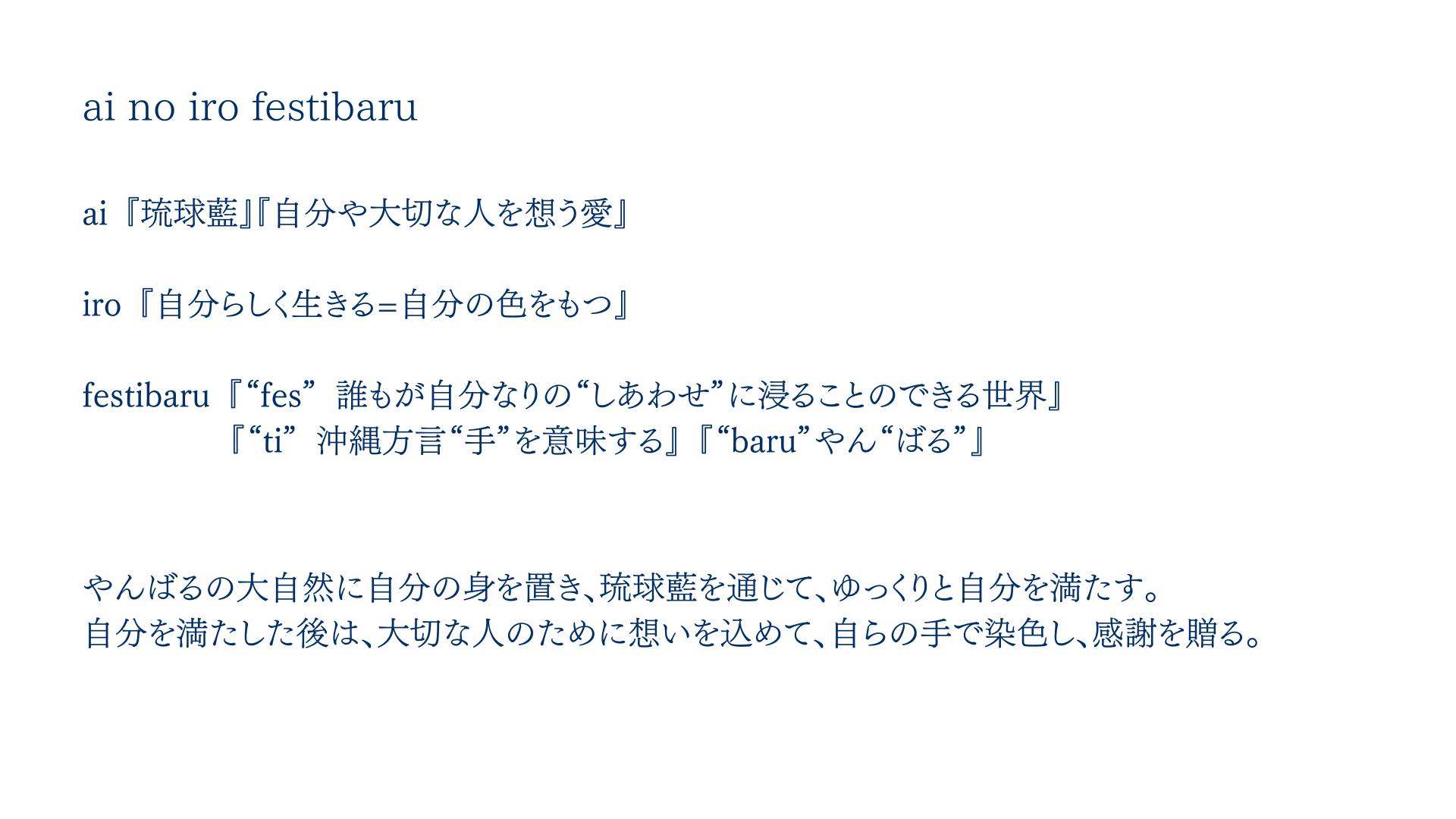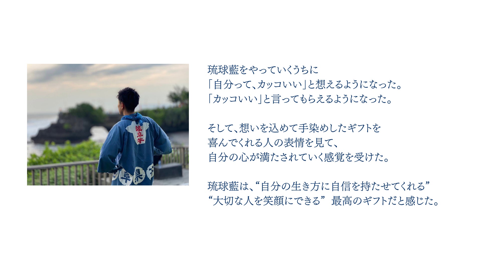 私自身、琉球藍を通じて人生が大きく変わったように、次は「琉球藍を通じて、挑戦する人に全力で寄り添う」というものです。