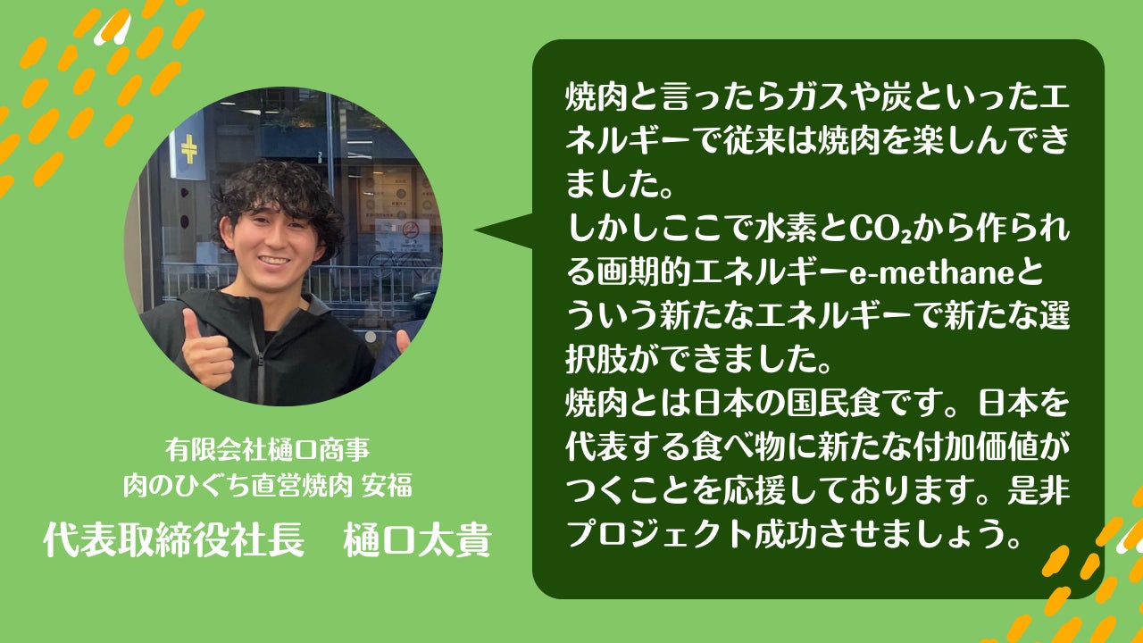 メタネーションの技術を取り入れた「e-メタン焼肉」を通じて、皆さんと一緒に地域の未来と環境について考えるきっかけを作りたいと思っています。これが、「未来のエネルギー」の第一歩。