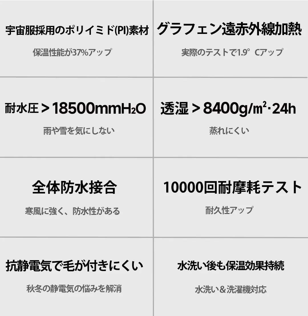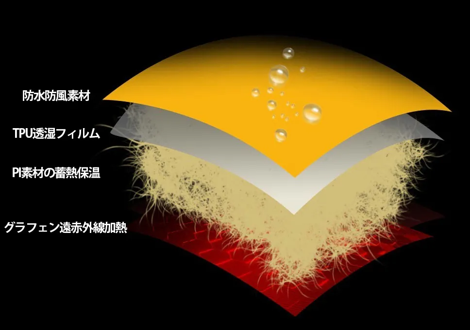 PI綿の蓄熱保温、純グラフェンによる遠赤外線加熱、防風・防水性能を備えた本格シェル構造により、全方位の保温システムを実現しました。