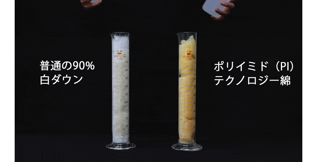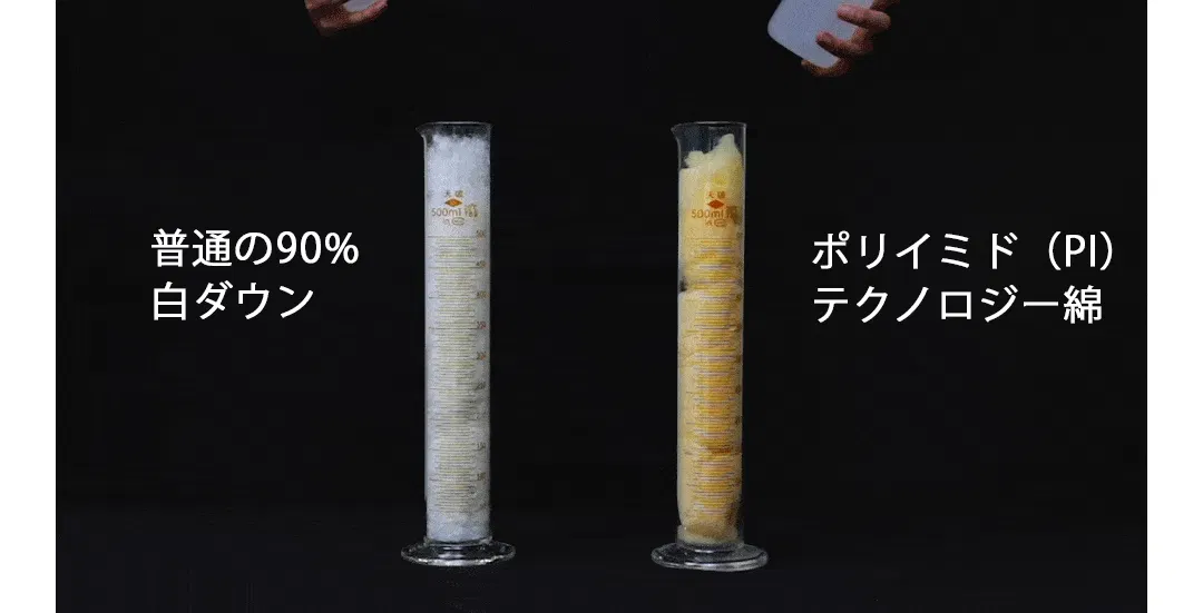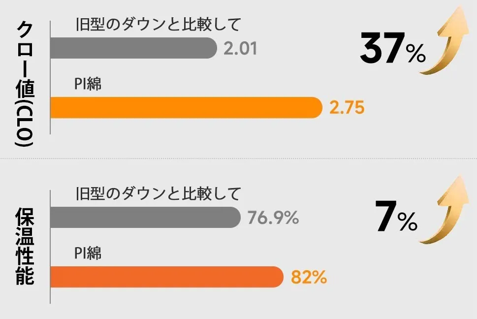 PI綿は従来の90%ダウンと比べて保温性能が37%向上。CLO値2.75、保温率82%を実現し、寒冷地でも快適な暖かさを提供します。