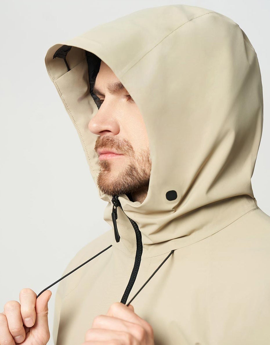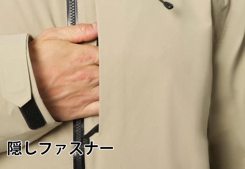ヘルメット型立体フードで防風・防雨効果を強化。熱圧着工法と隠し調節機能により、冷風や雨水をシャットアウト。広めのツバと金属ワイヤーで形を保ち、しっかりと雨を防ぎます。