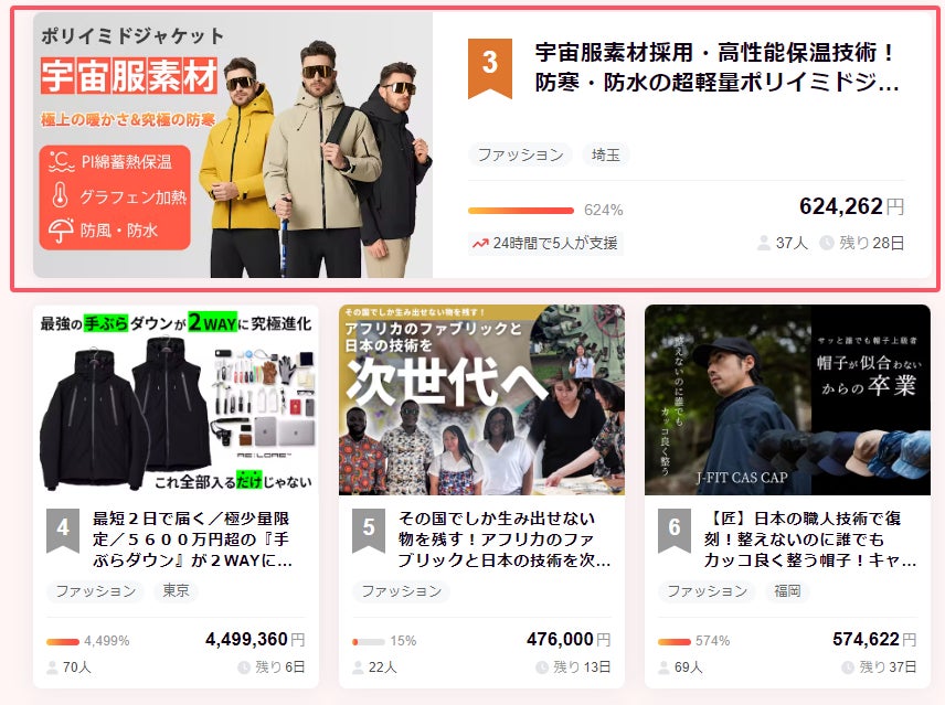 おかげさまで、本日CAMPFIREランキングのファッション部門において、第3位を獲得することができました。このような素晴らしい成果を手にすることができたのも、ひとえに皆様のお力添えによるものと、スタッフ一同、メーカーとともに感謝の気持ちでいっぱいです。