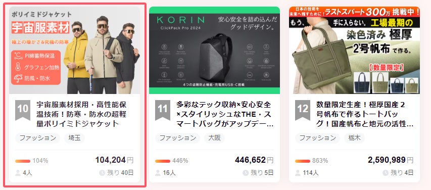 【皆様の温かいご支援に深く感謝申し上げます】このたびは、「宇宙服素材採用・高性能保温技術!防寒・防水の超軽量ポリイミドジャケット」プロジェクトにご支援いただき、誠にありがとうございます。おかげさまで、本日CAMPFIREランキングのファッション部門において、第3位を獲得することができました。このような素晴らしい成果を手にすることができたのも、ひとえに皆様のお力添えによるものと、スタッフ一同、メーカーとともに感謝の気持ちでいっぱいです。プロジェクトは現在も進行中です。より多くの皆様にご満足いただけるよう、最後の瞬間まで全力で取り組んでまいります。引き続き、温かいご支援を賜りますようお願い申し上げます。