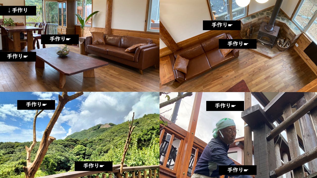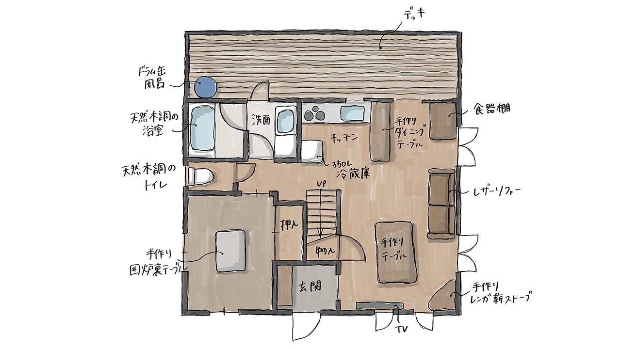 ログハウスには自分で設置した風呂と薪ストーブ、手作りの家具やウッドデッキなど、長い年間かけて積み上げてきたDIYの数々が詰まっていました。