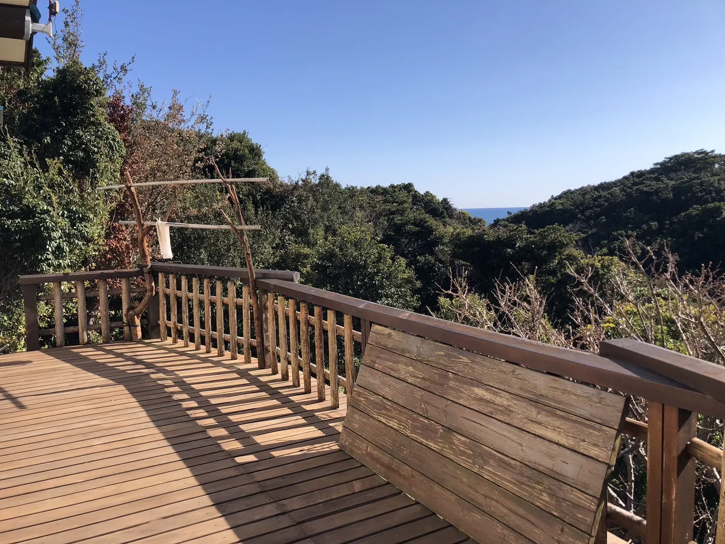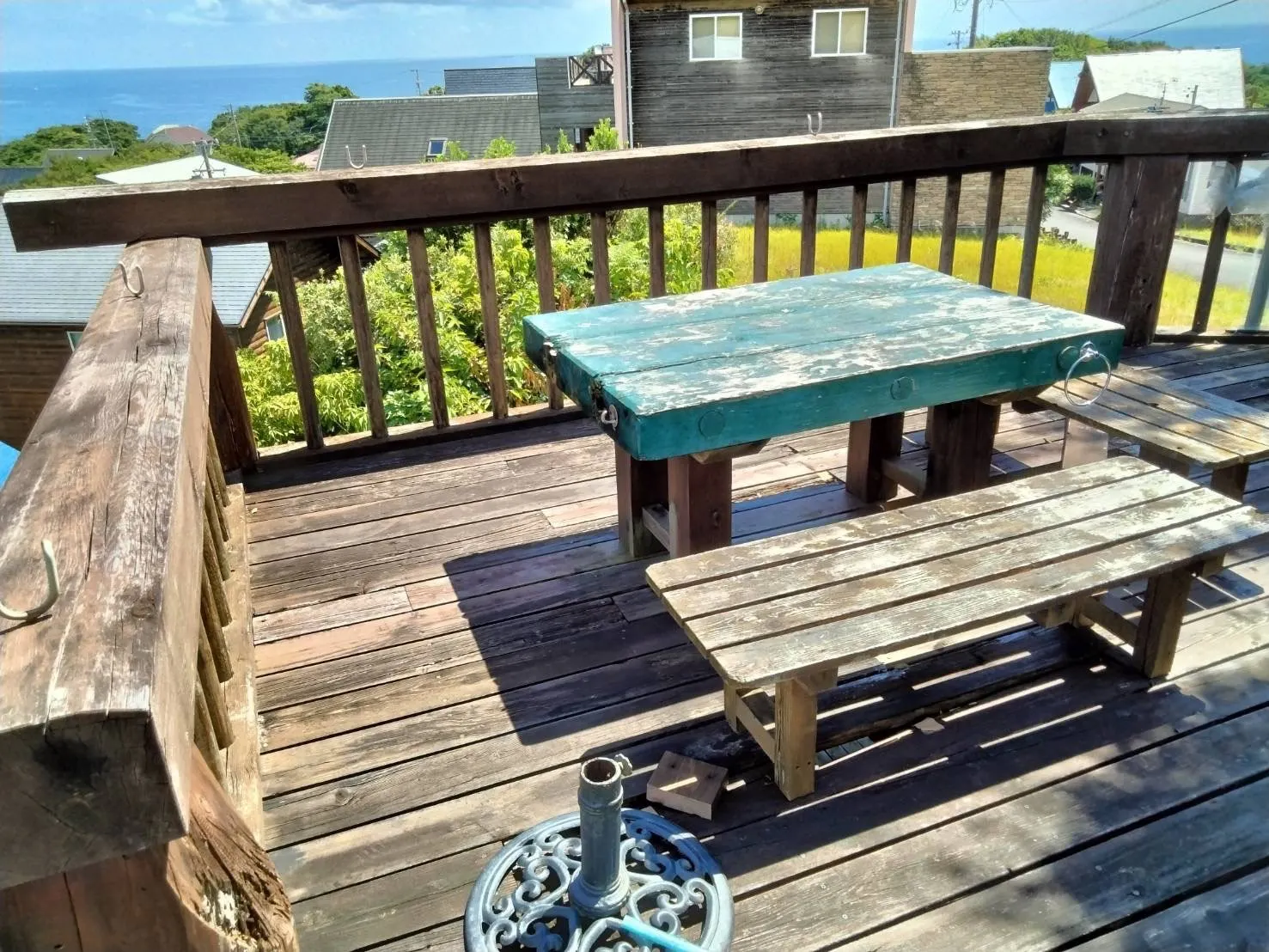 現在は損傷が大きく、防腐剤や塗料も落ちている状態です。再改修も考えましたが、予算が追い付かず、断念していましたがやはりウッドデッキで過ごす時間を楽しんでもらいたいという想いから、このウッドデッキの改修をお願いしたいと思っています。ウッドデッキには、ポータブルの簡易バスタブやドラム缶風呂も設置でき、ワンちゃんとお風呂に入っていただけます。BBQはもちろん、目の前の山々を見ながらゆっくりと朝食など楽しんでもらいたいと思います。