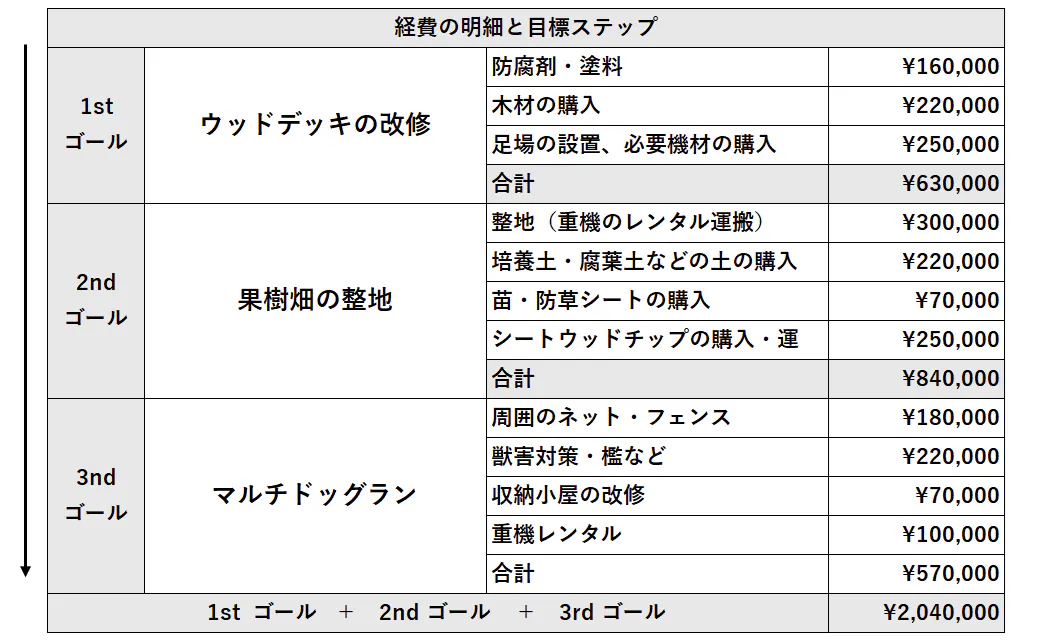 数年かけて進める大きな夢ですが、お孫さんと一緒に来ても楽しめるような自然体験できる場を提供したいと考えています。まずは現実的な目標である「ウッドデッキ改修」を達成し、その後に「果樹園」「マルチドッグラン」とこの夢に向かって進みます。