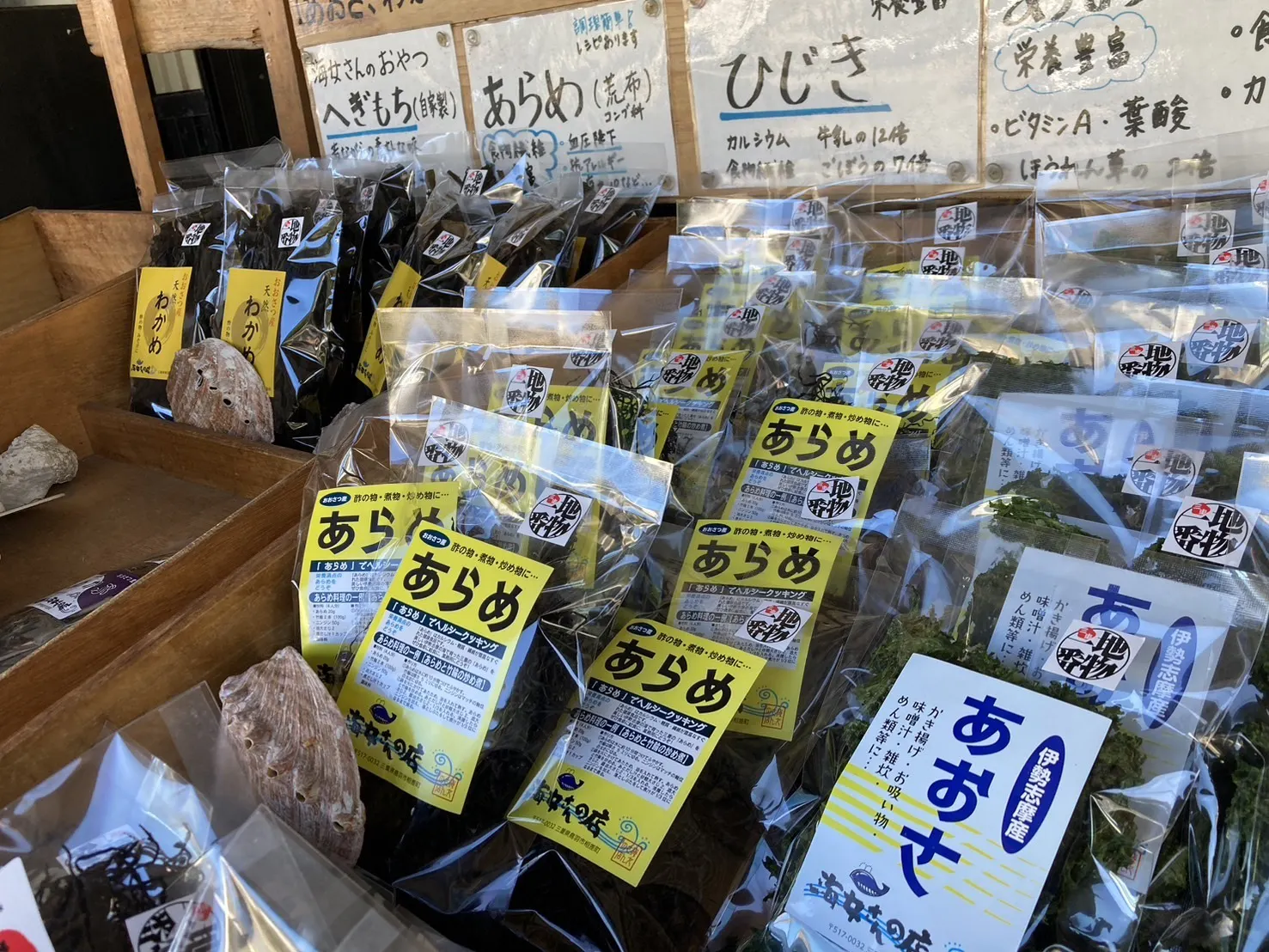 (地元漁師さんの手作り、鹿肉ジャーキーや海女さんのあおさをお送りします。)