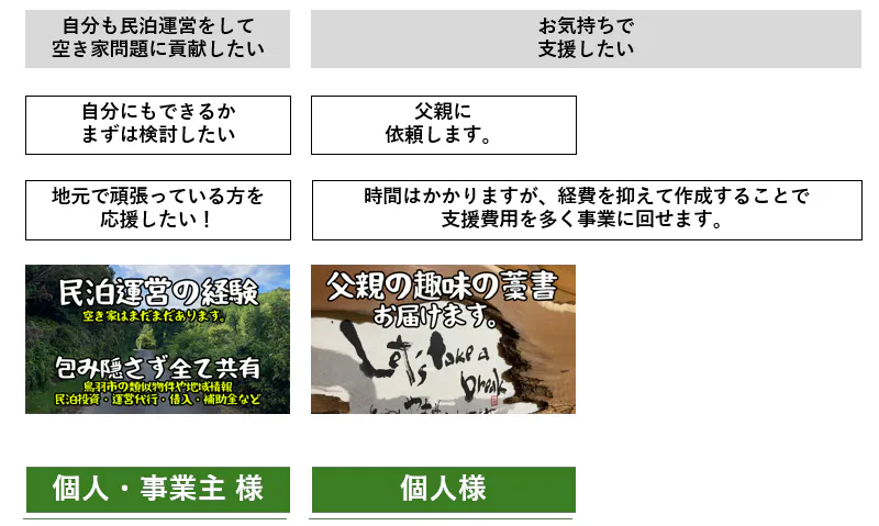 今でお世話になった関係者や知人や身内のサポートを通じて、お返しできるように設定し、気持ちを込めて支援者様にお返していきたいと思っています。