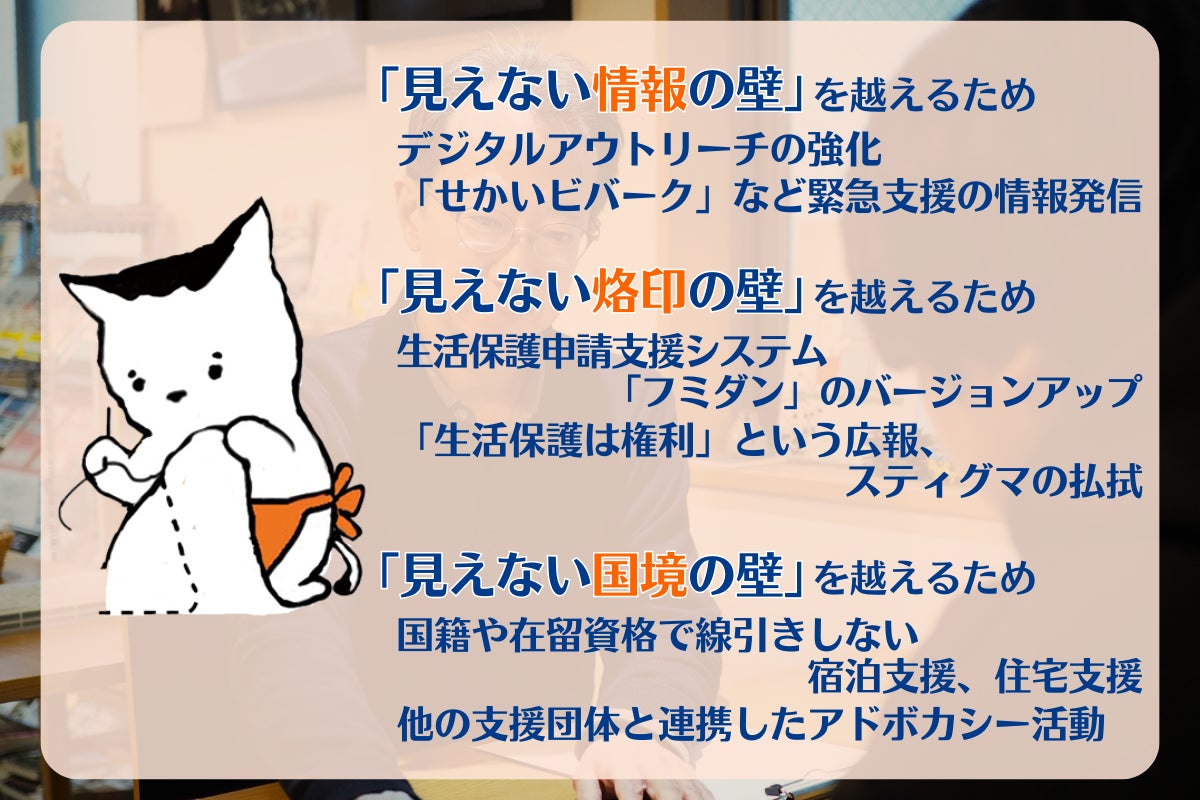 この冬、私たちは行き場のない全ての人に支援を届けるため、「情報」「烙印」「国境」という3つの見えない壁を越えるチャレンジに取り組みます。