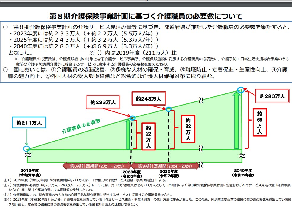 〇介護の現状としては、2019年度の介護職員数約211万人に加えて、 2025年度末までに約32万人(合計で約243万人)、2040年度末までに約69万人(合計で約280万人)、2025年度末まででみれば、 年間5.3万人程度の介護人材の確保が必要との見込み。