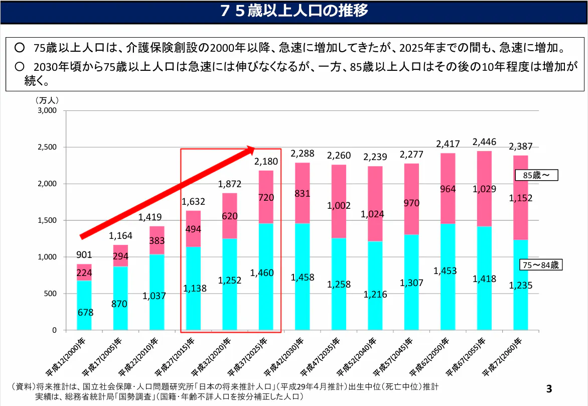 2030年頃から75歳以上人口は急速には伸びなくなるが、一方、85歳以上人口はその後の10年程度は増加が 続く。