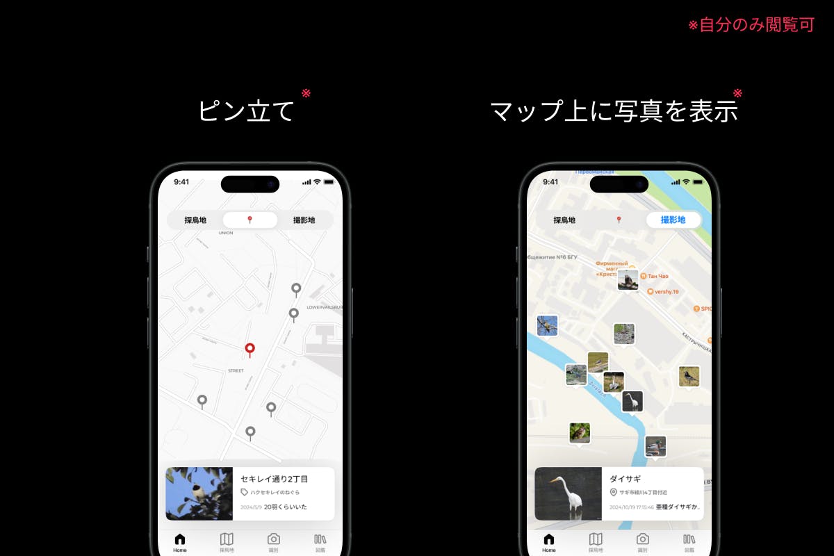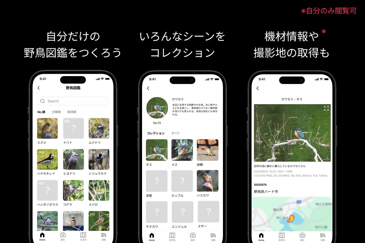 行きたい探鳥地や秘密の撮影スポットにピンを立ててブックマーク。また写真からの位置情報取得を許可することで、マップ上に写真を表示することも可能。また野鳥への影響を考慮しこれらの情報は第三者には公開されません。