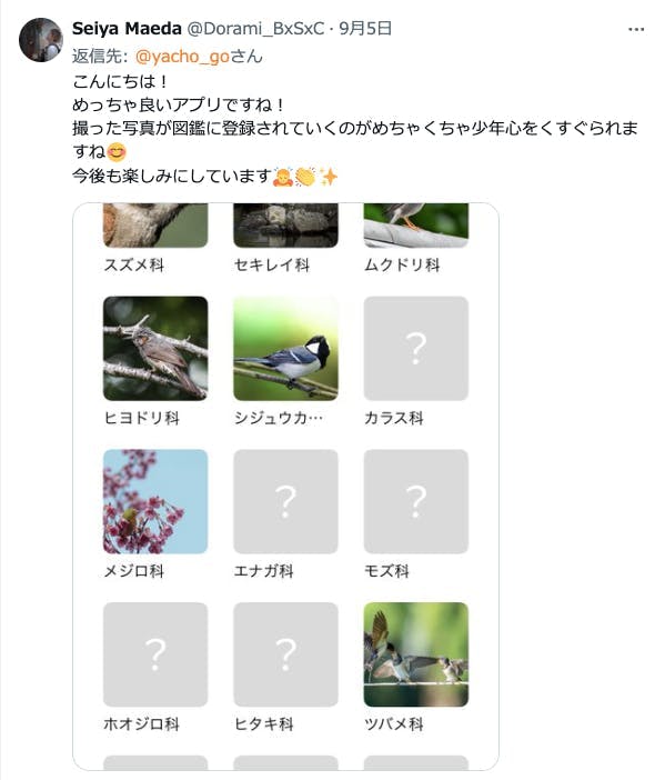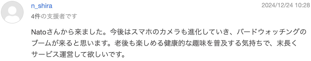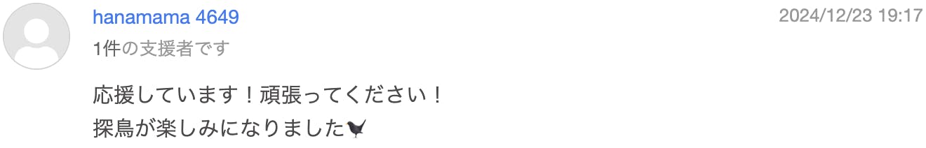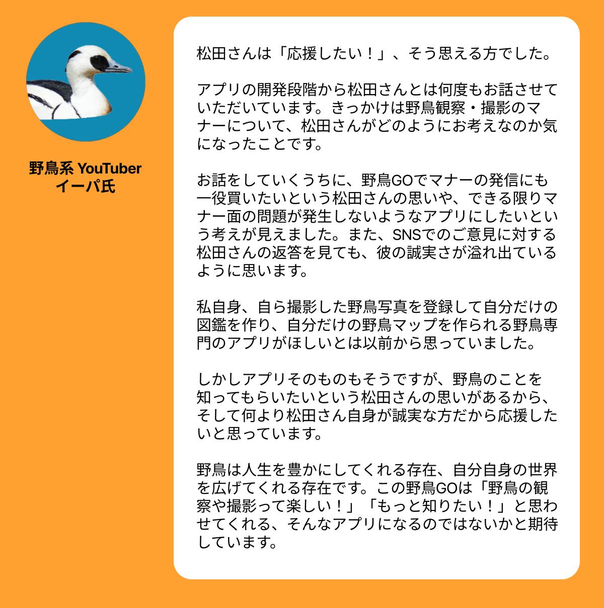 図鑑の作成などでご協力いただいている野鳥系YouTuberのイーパさんからありがたい応援コメントをいただいています。