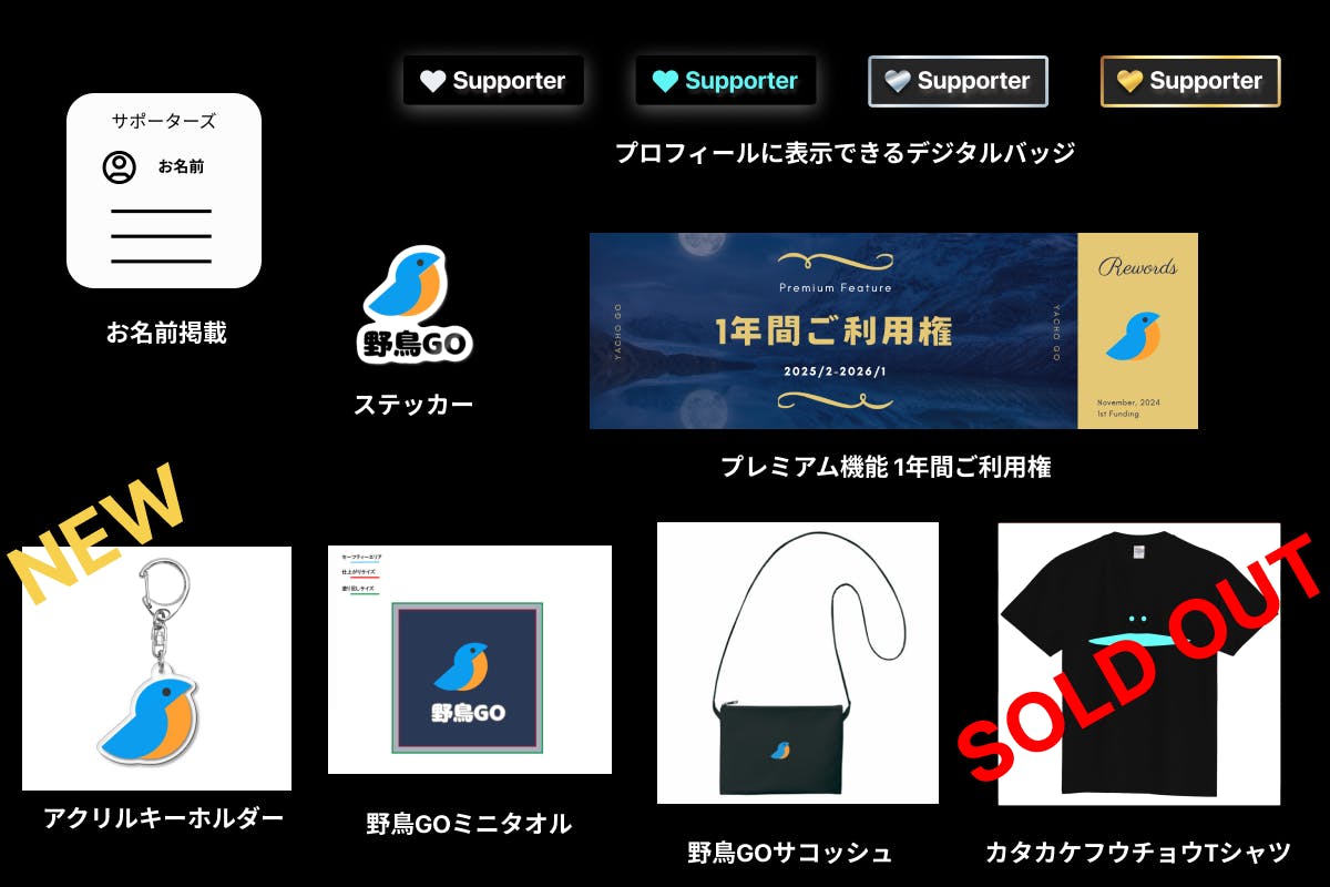 ささやかではありますが、支援していただけたお礼として支援者ページへの掲載や野鳥GOアプリのプロフィールに表示できるサポーターバッジ、プレミアム機能の1年間ご利用権、野鳥GOロゴ入りの限定グッズなどをお送りさせていただきます。またお礼のメッセージやメールはもちろん皆様全員にさせていただきます。