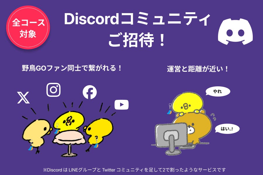 全コース対象で今回のご支援者様限定のDiscordコミュニティ参加特典を追加しました!DiscordはLINEグループとTwitterコミュニティを足して2で割ったようなサービスですが、この中でどうこうというよりここで野鳥GOきっかけで繋がっていただいた方とXやmixi2, facebookのコメント欄などで絡んでいただくとより楽しいかと思います!