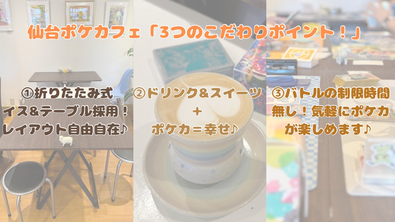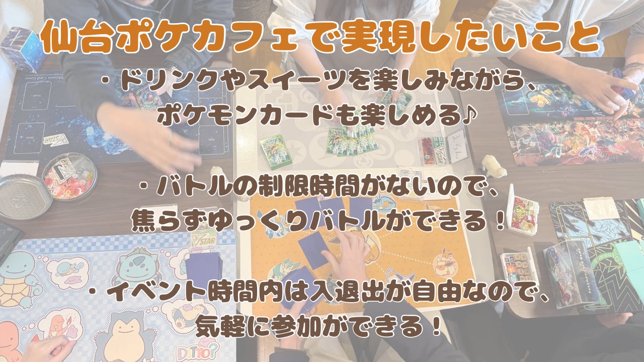 仙台ポケカフェが店舗としてOPENしてからも、上記の3つは維持しつつ、さらにポケモンカードが気軽に楽しめるカフェを実現していきます!