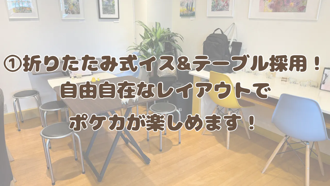 参加人数に合わせてイスとテーブルを調整できるので、少人数の際は広々とした店内で、大人数の際はたくさん並べてみんなでポケモンカードを楽しめます♪