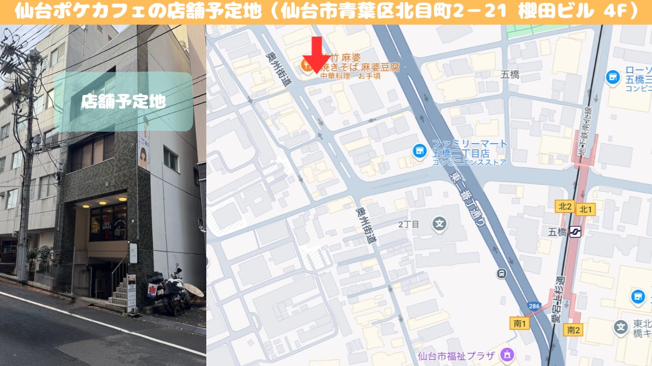 2025年春に新たにOPENする仙台ポケカフェは、仙台市地下鉄南北線「五橋駅」から徒歩7分に位置します。