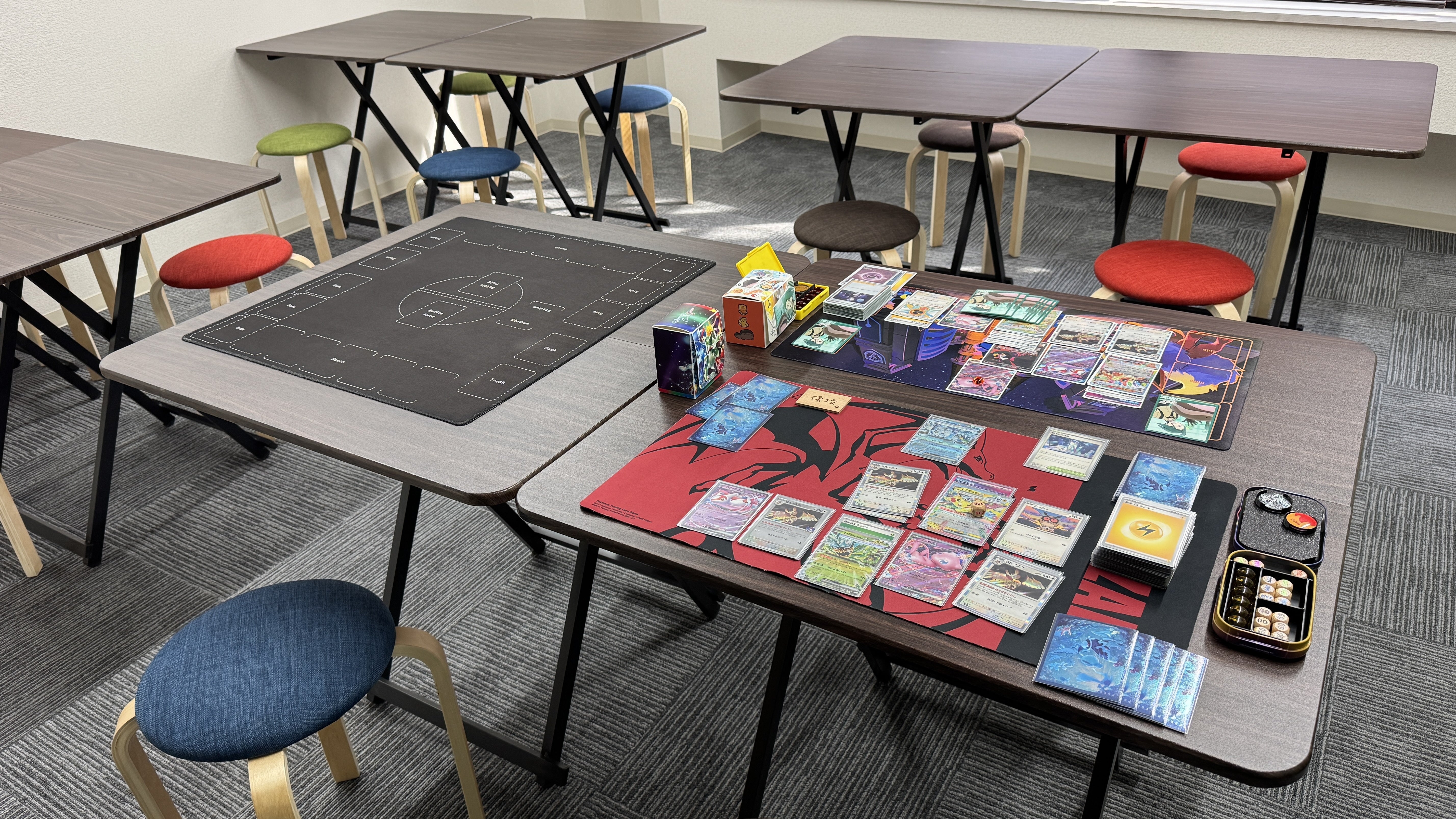 参加人数に合わせてイスとテーブルを調整できるので、少人数の際は広々とした店内で、大人数の際はたくさん並べてみんなでポケモンカードを楽しめます♪