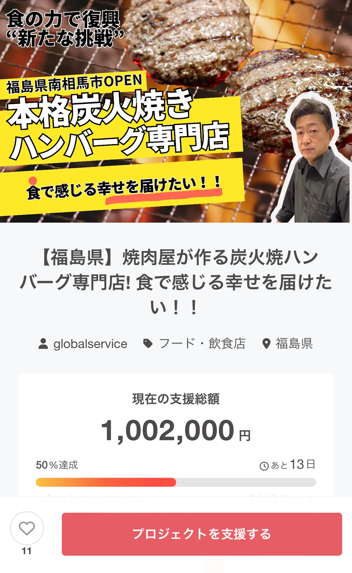 2025/01/29 14:11クラファンスタートから終了まで残り10日余りになりました。現在目標金額の半分を達成することができ、ご支援したいただいた皆様には大変心から感謝申し上げます。目標達成に向け、残りの期間ラストスパートを切っていきます。皆様に喜んでもらえるようなお店にするために、OPENに向け、お店の改装や商品提供の準備を着々と進めております。また、福島県南相馬の地へ沢山の方々に足を運んでもらえるように、今回のクラファンではリターンでお得な食事券を盛り込んでおりますので、お知り合いや繋がりある方に広めていただけますと幸いです。残り10日余り!最後まで、皆様のご協力応援のほど宜しくお願いいたします!!#福島県#南相馬市#ハンバーグ専門店#炭火焼肉ご縁や#クラファン もっと見る